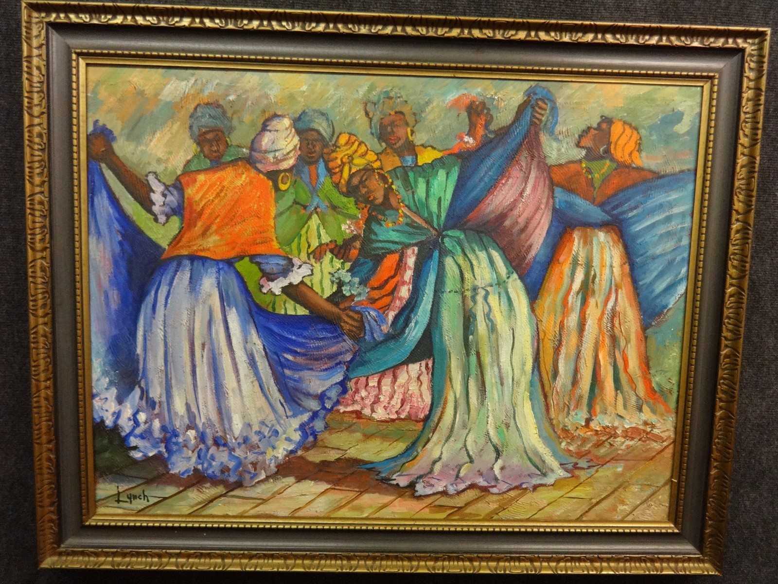 Large oil on canvas signed by Mervyn A Lynch, who has exhibited in England, Canada, USA, Carabean. Title 'Bele Dancers'