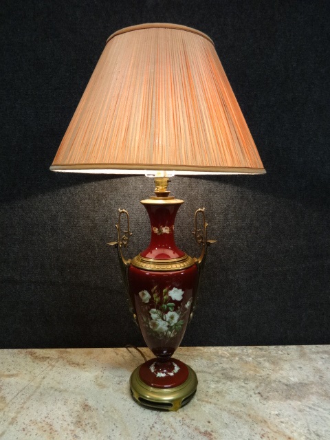 An excellent quality French porcelain lamp with hand-painted decoration, brass handles and mounts. In excellent original condition. Salmon shade included.