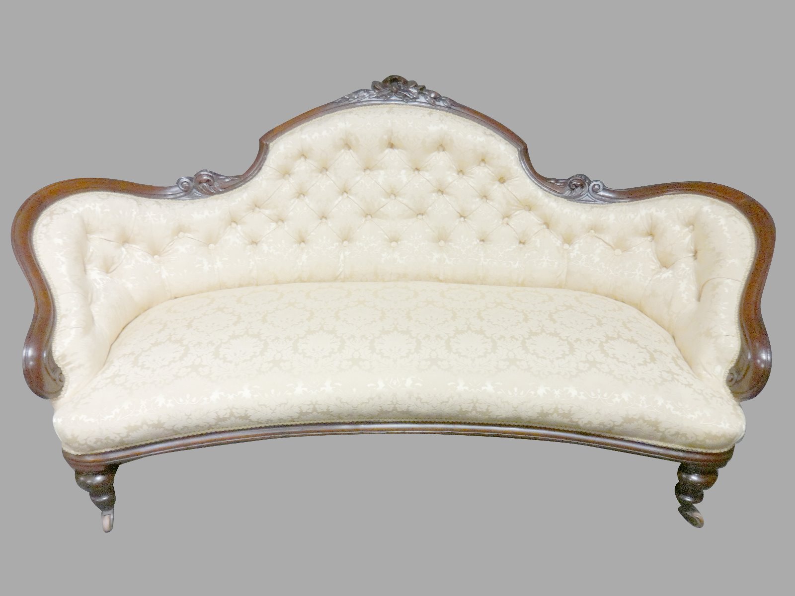 This is a superb 19th Century Victorian antique deep buttoned mahogany curved end couch, recently upholstered in gold damask, turned feet and pot castors, in excellent condition.