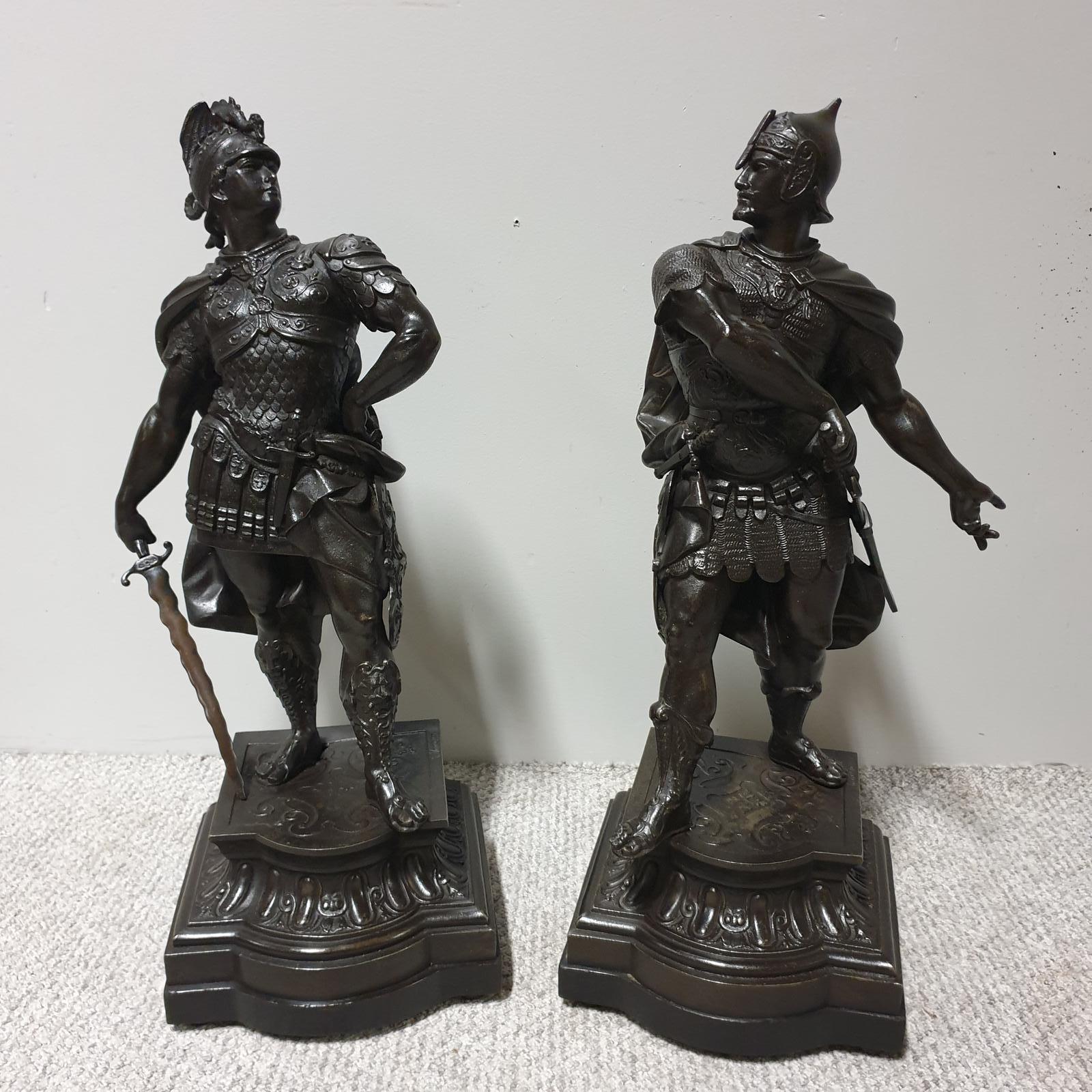This is a large and spectacular pair of 19th Century antique warrior spelter figures on wooden plinths, signed on plinth, in excellent original condition.