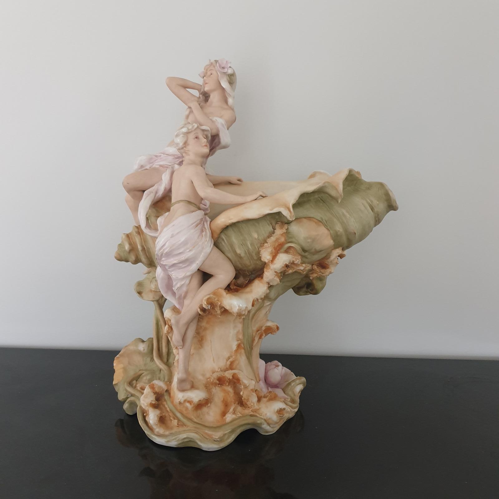 This is a lovely Art Noveau conch shell with two women draped over by Royal Dux, excellent condition, pink triangle, date mark 710.