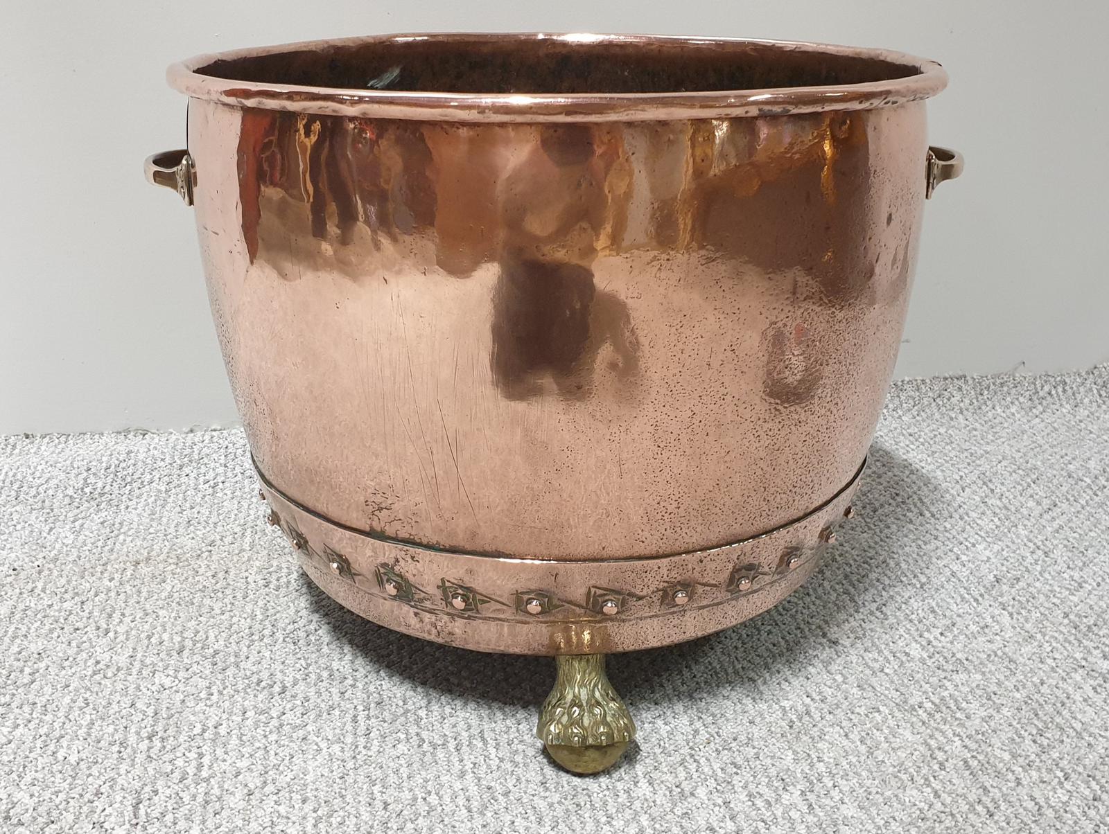 This is a superb 19th Century Victorian antique copper rivetted log or coalbin made by Al, 30 Gallon bin, with brass carrying handles and bras hairy ball and paw feet, in excellent condition.