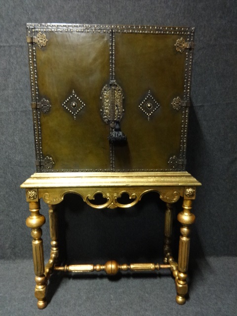 This is a stunning green leather covered cabinet with brass studs, hinges and escutcheons, on gilt stand, single shelf, oak back boards, waxed and cleaned, in excellent condition.