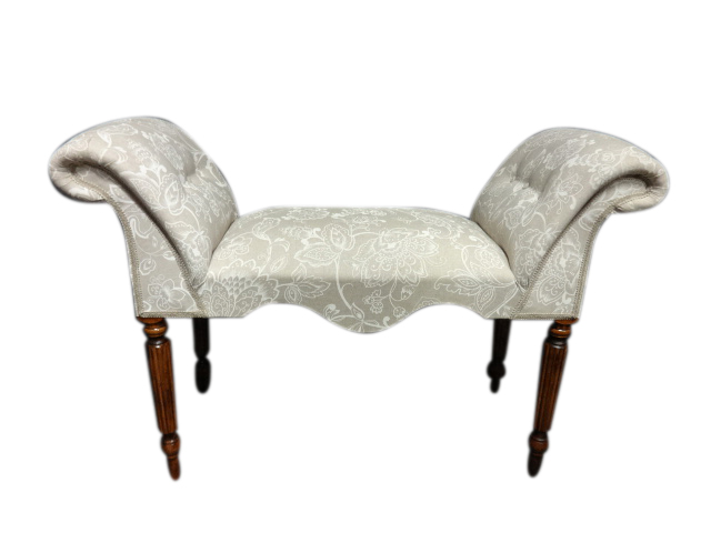 This is a very pretty linen covered window seat with mahogany fluted legs, in excellent condition.