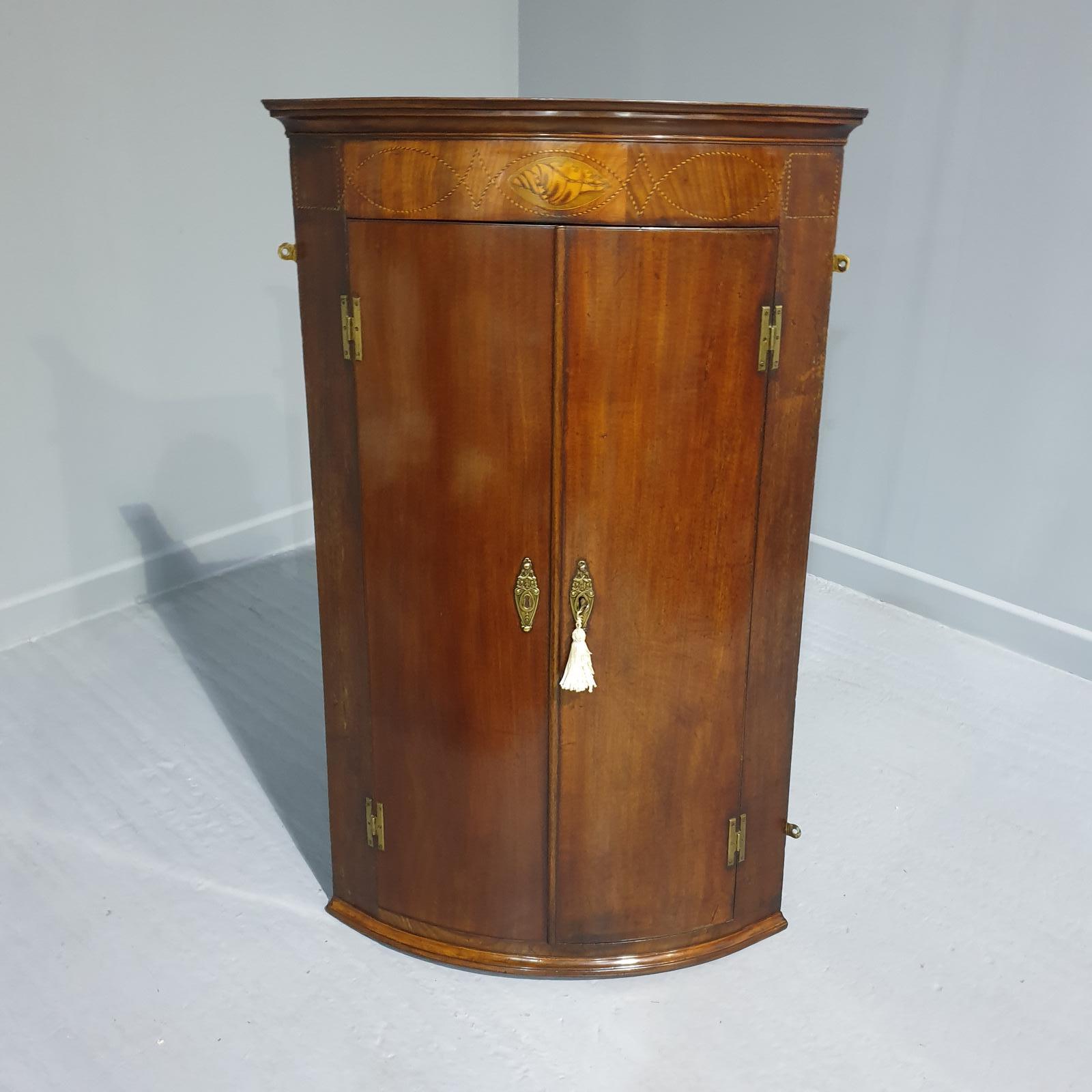 This is a lovely 18th Century Georgian antique inlaid mahogany hanging corner cabinet, original condition and a wonderful colour with key.