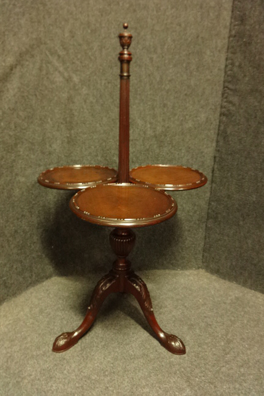 A very good carved mahogany Antique three tier cake stand, standing on centre pedestal, in excellent condition.