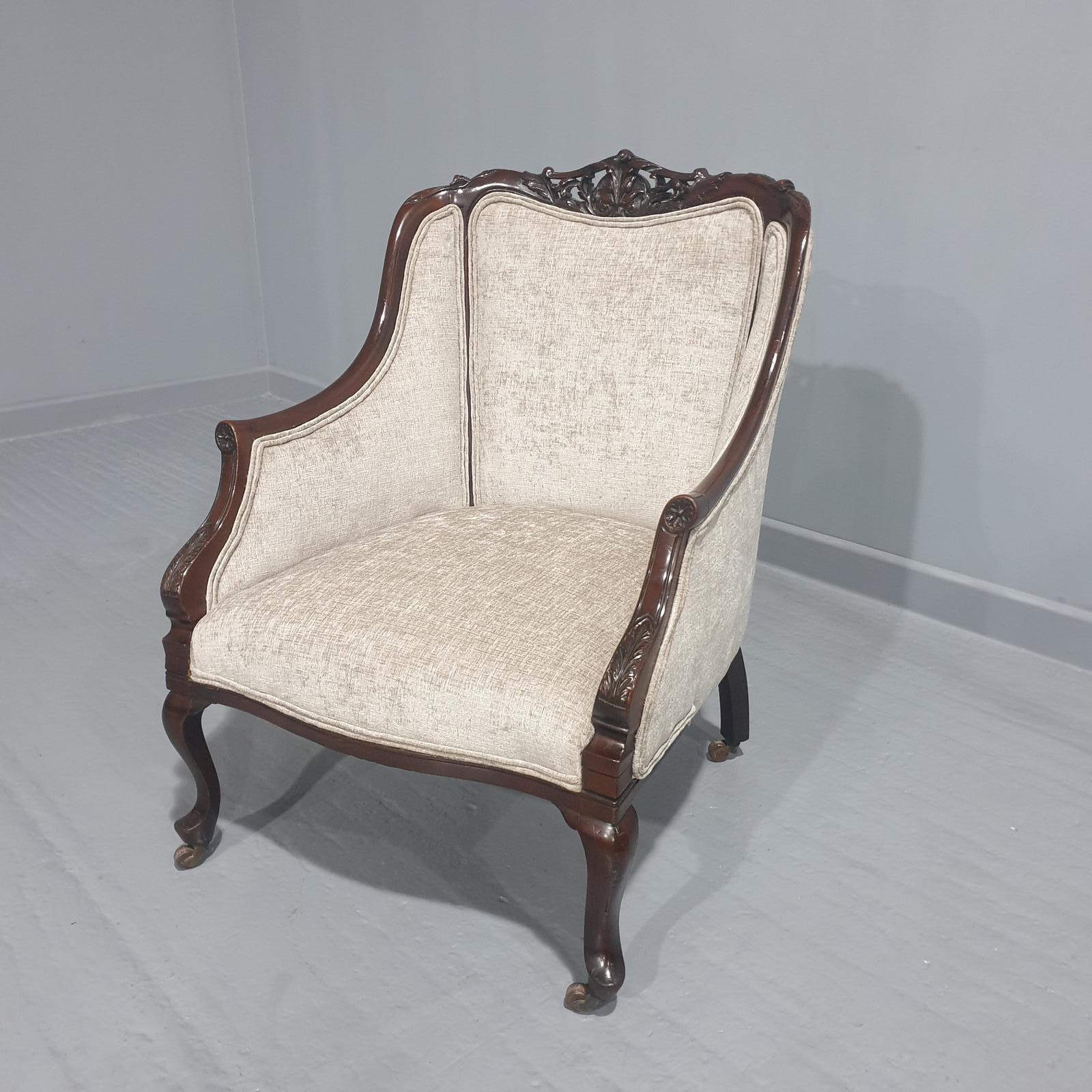 This is a super late 19th Century Victorian mahogany armchair newly upholstered in grey plush, in excellent original condition.