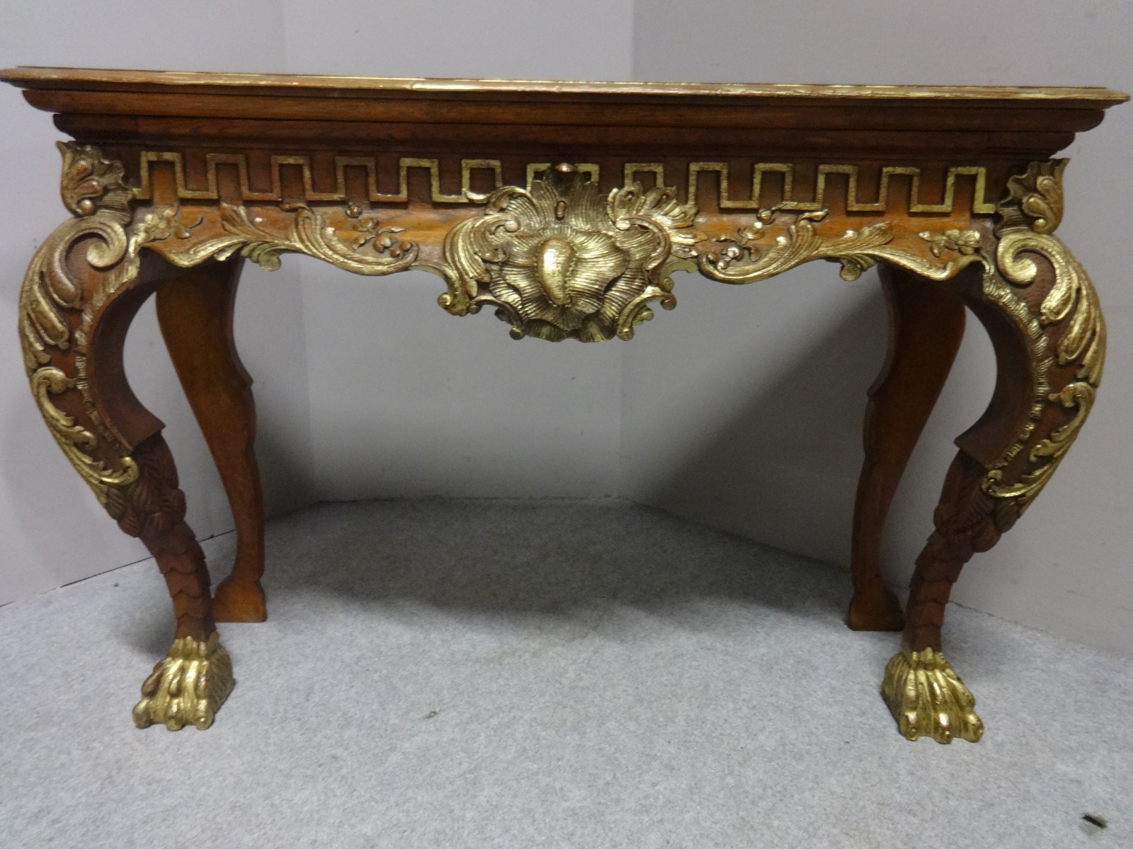 A very nice carved oak and parcel gilt console table in excellent overall condition, slight wear on gilding commensurate with age.