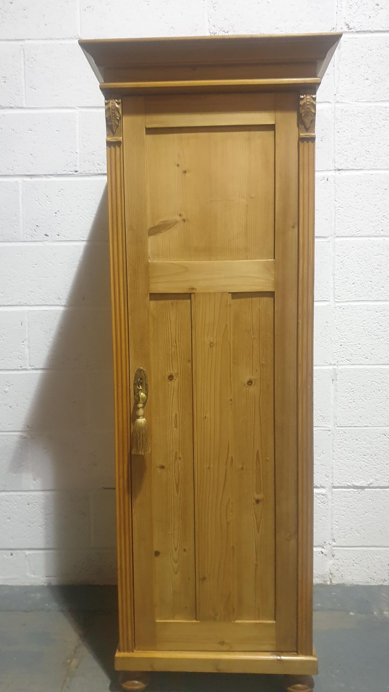 A lovey stripped pine Victorian Cabinet with feeded panel door, reeded sides and corbals to the top, original brass key plate and key, three internal shelves, excellent colour and condition.
