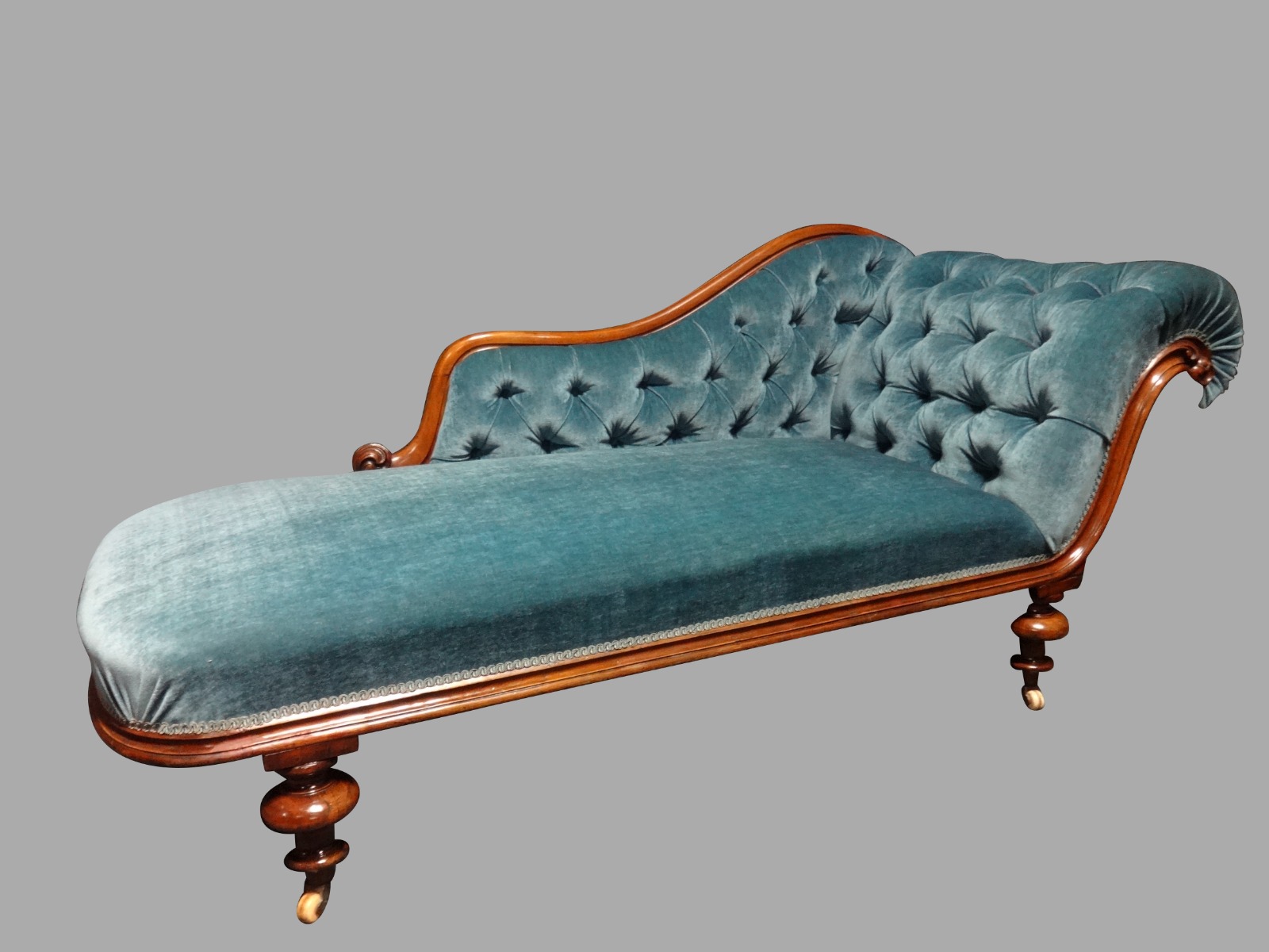 This is a very good Victorian antique walnut chaise lounge with original blue plush, standing on white castors, in very good condition.
