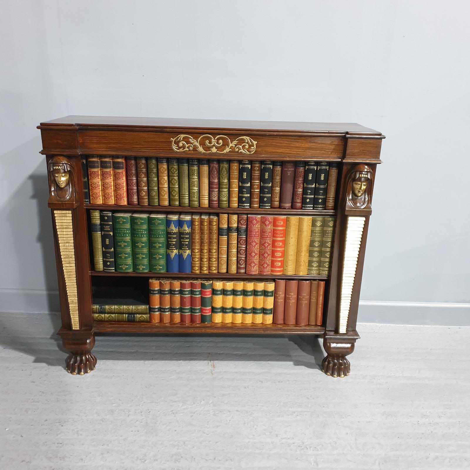 This is a very nice mahogany open adjustable library bookcase, two sheves, gilt detailing, egyptian carved heads and feet, in overall excellent condition.