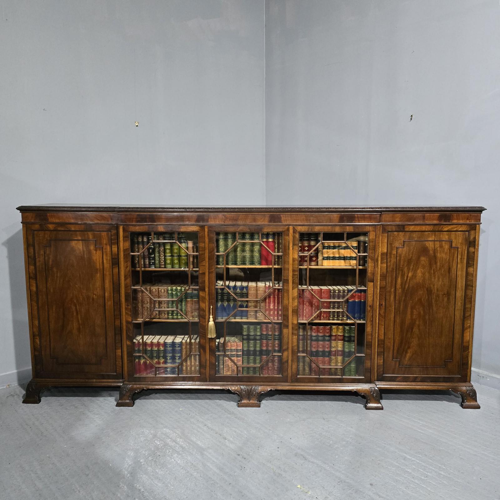 A top quality Victorian Chippendale style mahogany breakfront library bookcase, three central astral glazed doors, each with two solid mahogany adjustable shelves, brass shelf supports, solid panelled door to each end, one enclosing two adjustable shelves and the other three drawers with gilt metal knobs and space below, splits into six pieces for ease of moving, original working key, excellent colour and outstanding condition.
