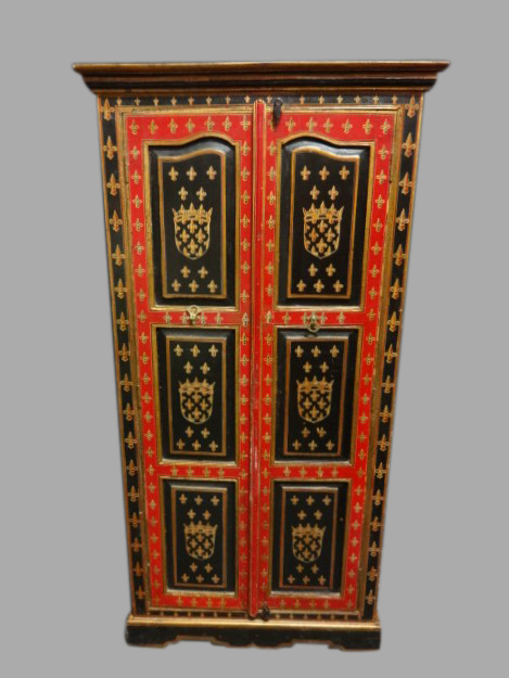 This is a superb heraldic painted hardwood hall wardrobe, with 2 inner shelves (top and bottom) and hanging rail, brass handles, in very good original condition.