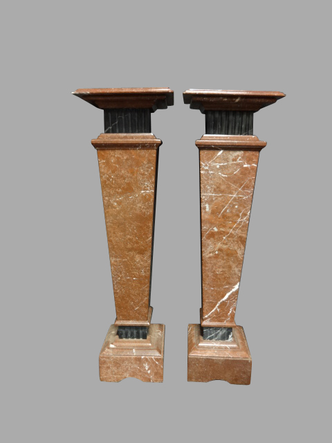 These are a superb pair of rouge marble pedestals with black and white grained insets, turning tops, in very good condition.
