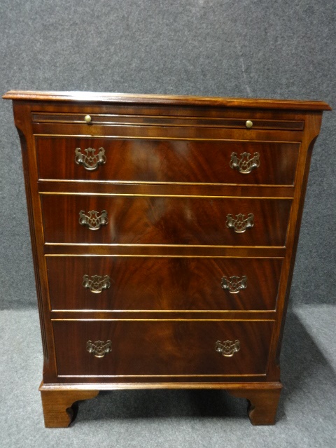 This is a pretty 4 drawer mahogany chest of drawers with brushing slide, brass handles, in excellent repolished condition.