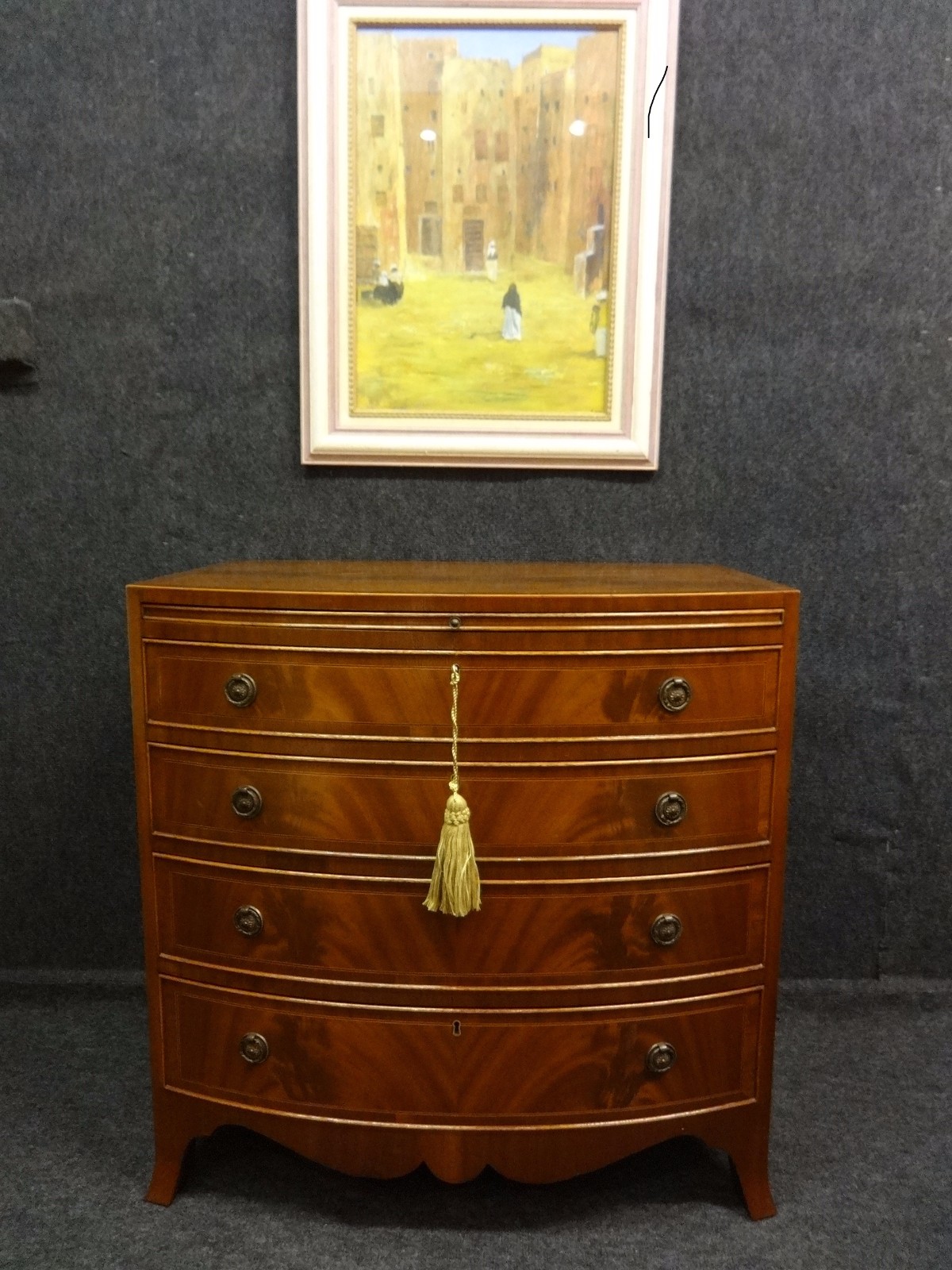 Excellent condition, small mahogany 4 drawer bowed chest of drawers with crossbanding and ebony and boxwood inlays, oak lined interior, brushing slide, brass handles.