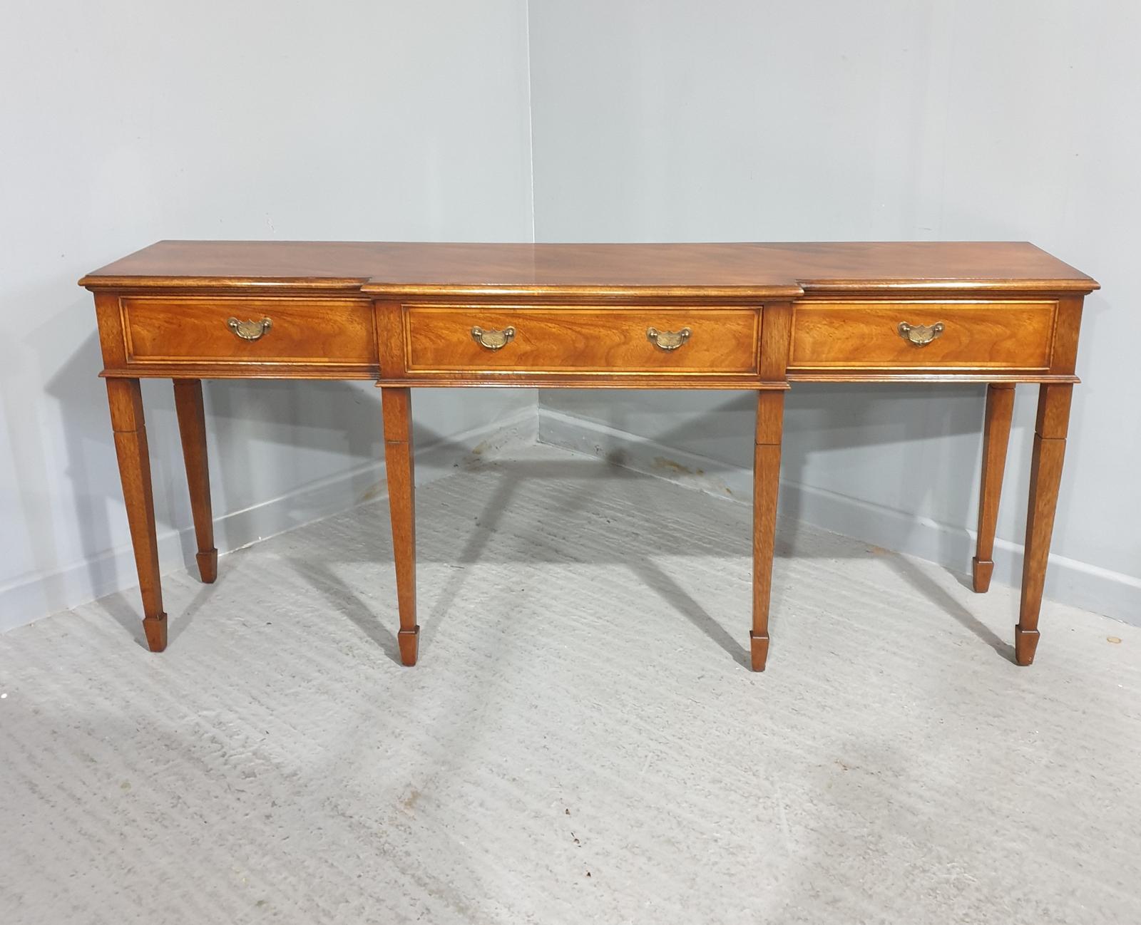 This is a very nice antique flame mahogany three drawer breakfront side table or console, in excellent overeall condition.