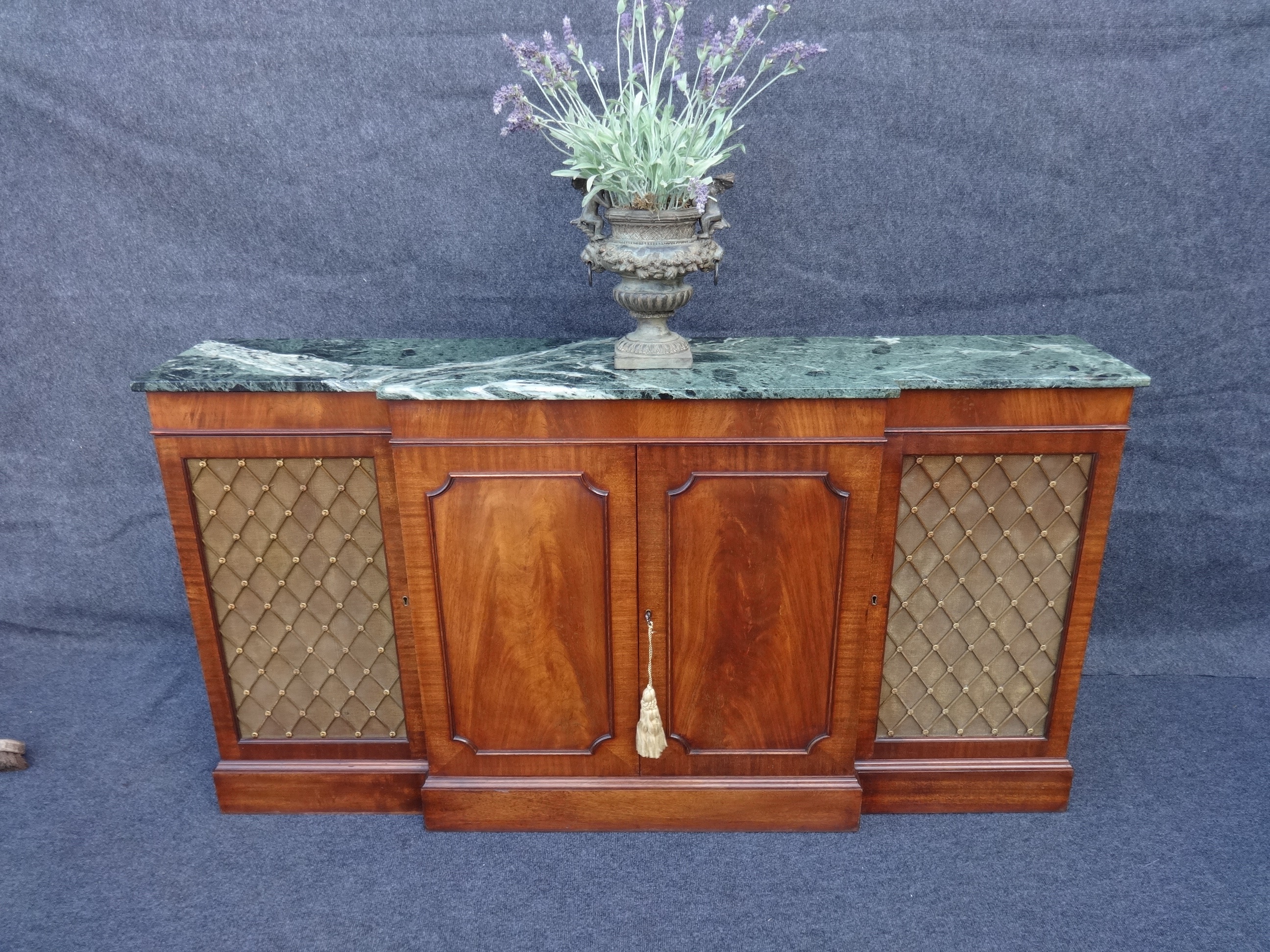 Offered for sale is this fantastic mahogany veneered breakfront credenza with brass grills and green marbled top.