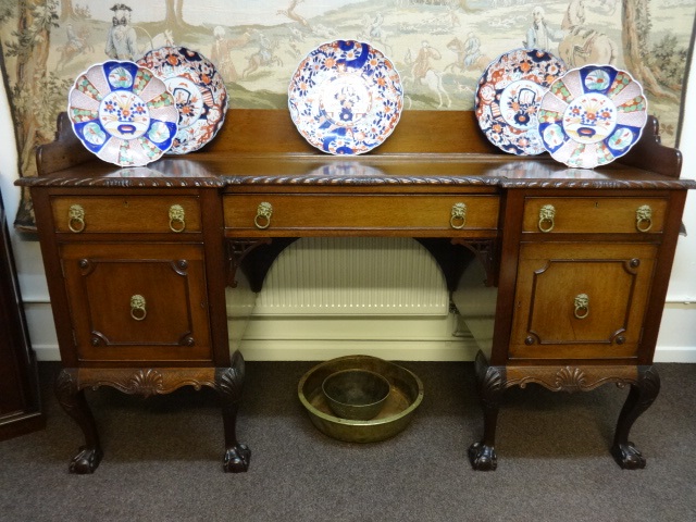 Mahogany breakfront sideboard, 3 drawers to the top over 2 cupboards standing on ball and claw legs, raised back with plate ridges, lions mask handles, all in very good condition.