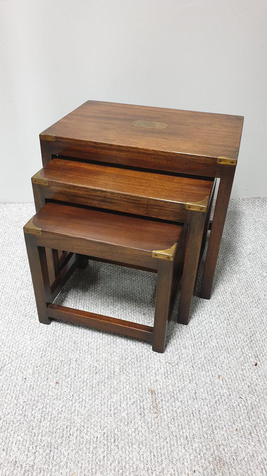 Very good mahogany campaign nest of tables, with brass corners and central brass plaque, very good overall condition.