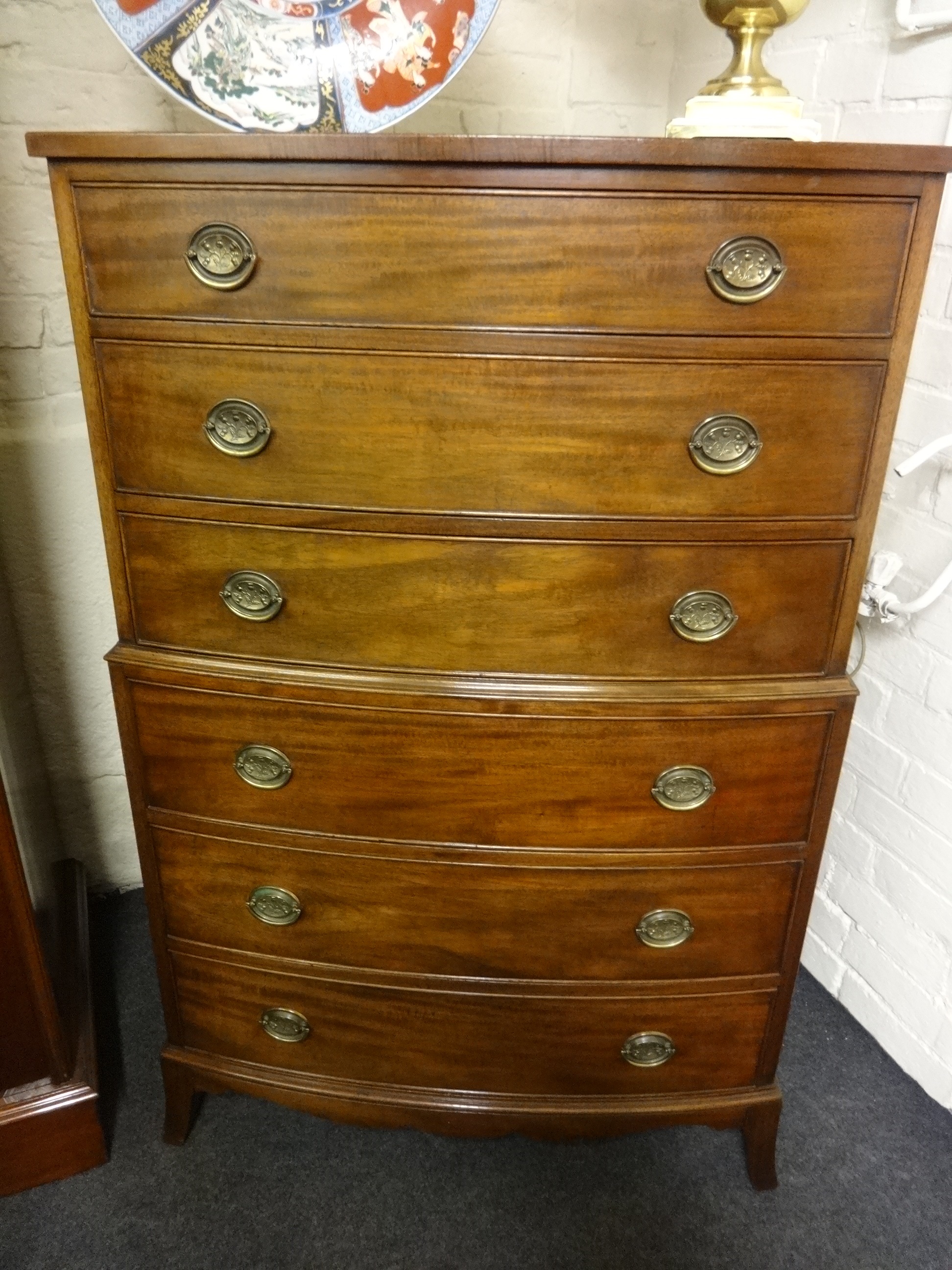 Mahogany bow front chest on chest of 6 drawers of small proportions, oak lined and in excellent condition, original brass handles, standing on outswept bracket feet, makers badge.