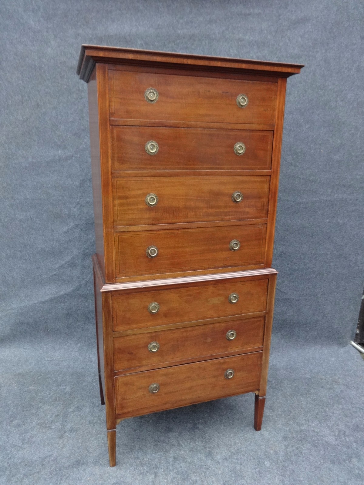 This is a fabulous antique mahogany chest on chest of 7 drawers, inlaid across the top with flowers and around the drawers, original handles, oak lined drawers, standing on slim tapered legs, of small proportions.