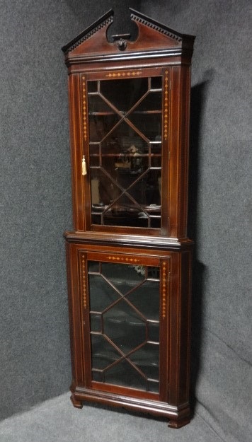 This is a very good mahogany inlaid corner cabinet, splits into two for ease of delivery. astral glazed doors, adjustable shelving, standing on ogre bracket feet, and in very good condition.