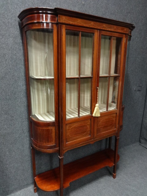 This is a very good bowed glass display cabinet, with inlaid swags and boxwood stringing. Relined and in very good condition.