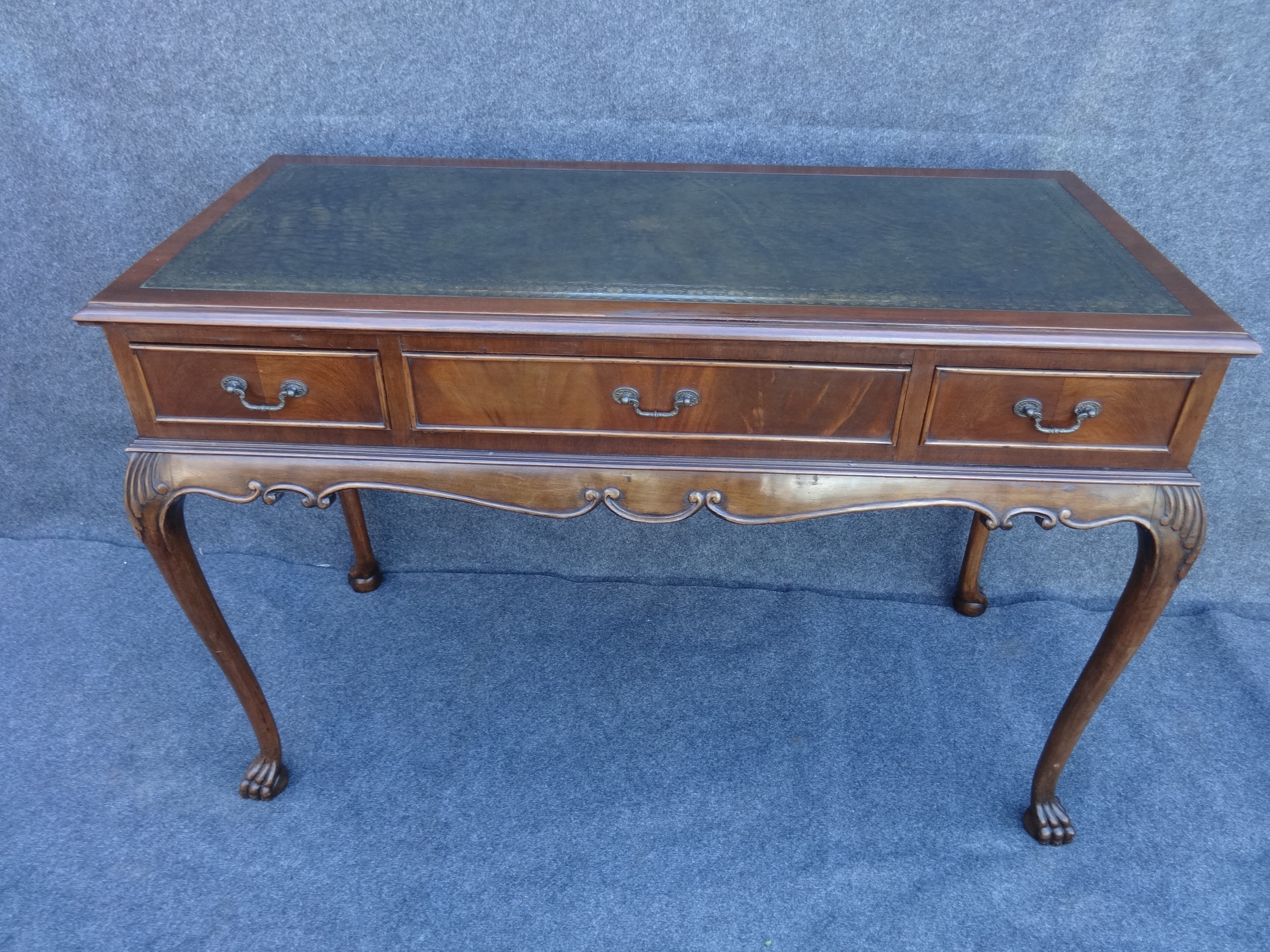 Offered for sale is this fabulous antique Edwardian mahogany Ladies writing table / writing desk which has 3 drawers with green leather, standing on lion paw legs, in original condition.