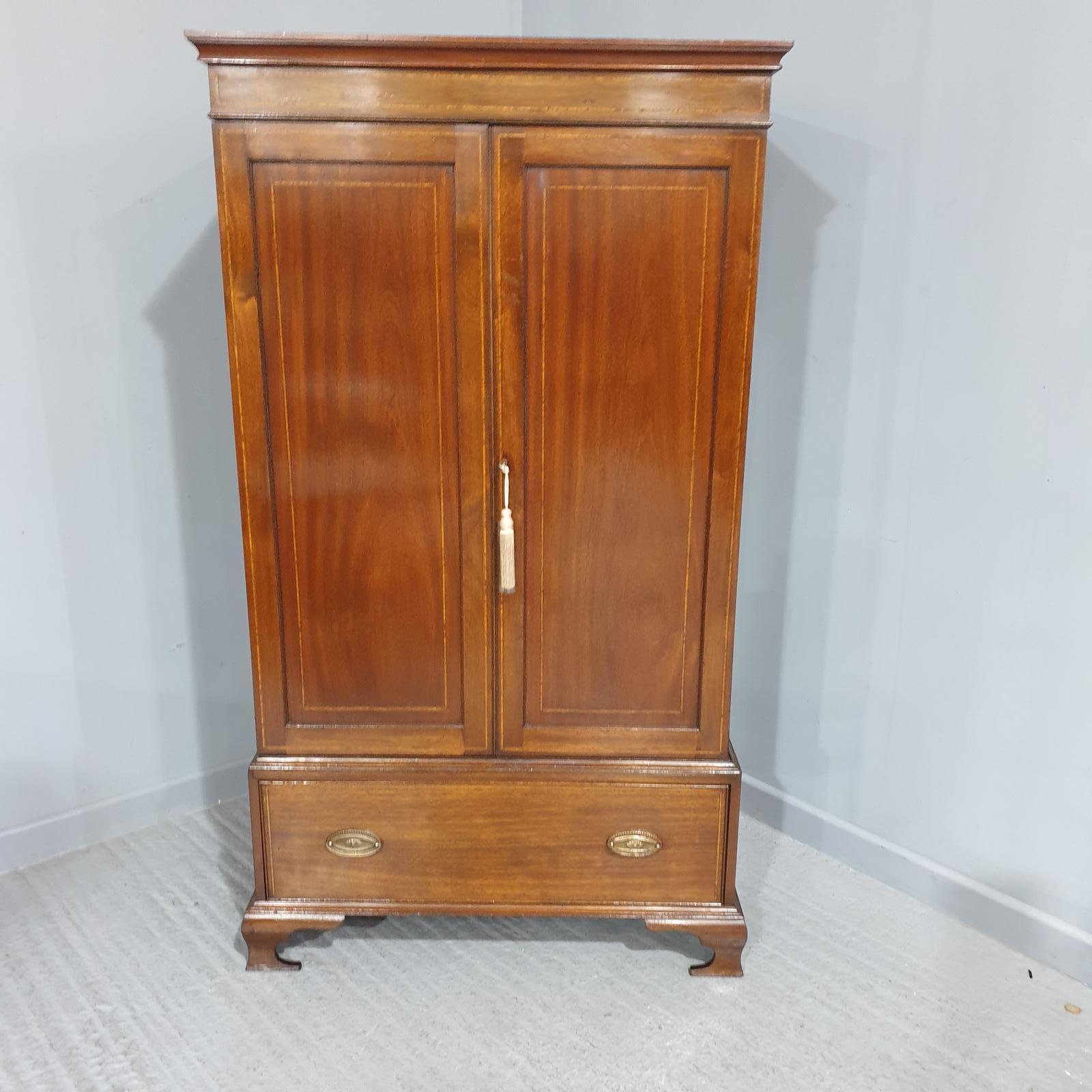 This is a very nice Edwardian antique inlaid mahogany linen press with two shelves and bottom drawer, in overall very good condiiton.