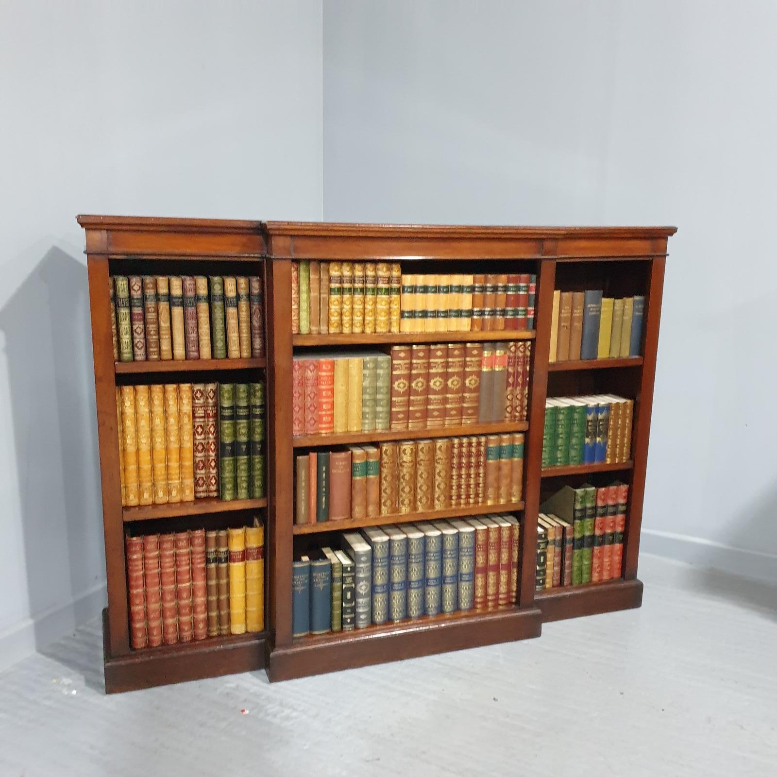 This is a very good English breakfront mahogany open library bookcase with seven adjustable mahogany shelves,great colour and condition.