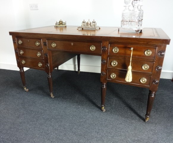 This is a freestanding mahogany pedestal desk, in very good original condition. It has 7 full depth drawers and it stands on reeded legs and metal castors. It has a good colour.