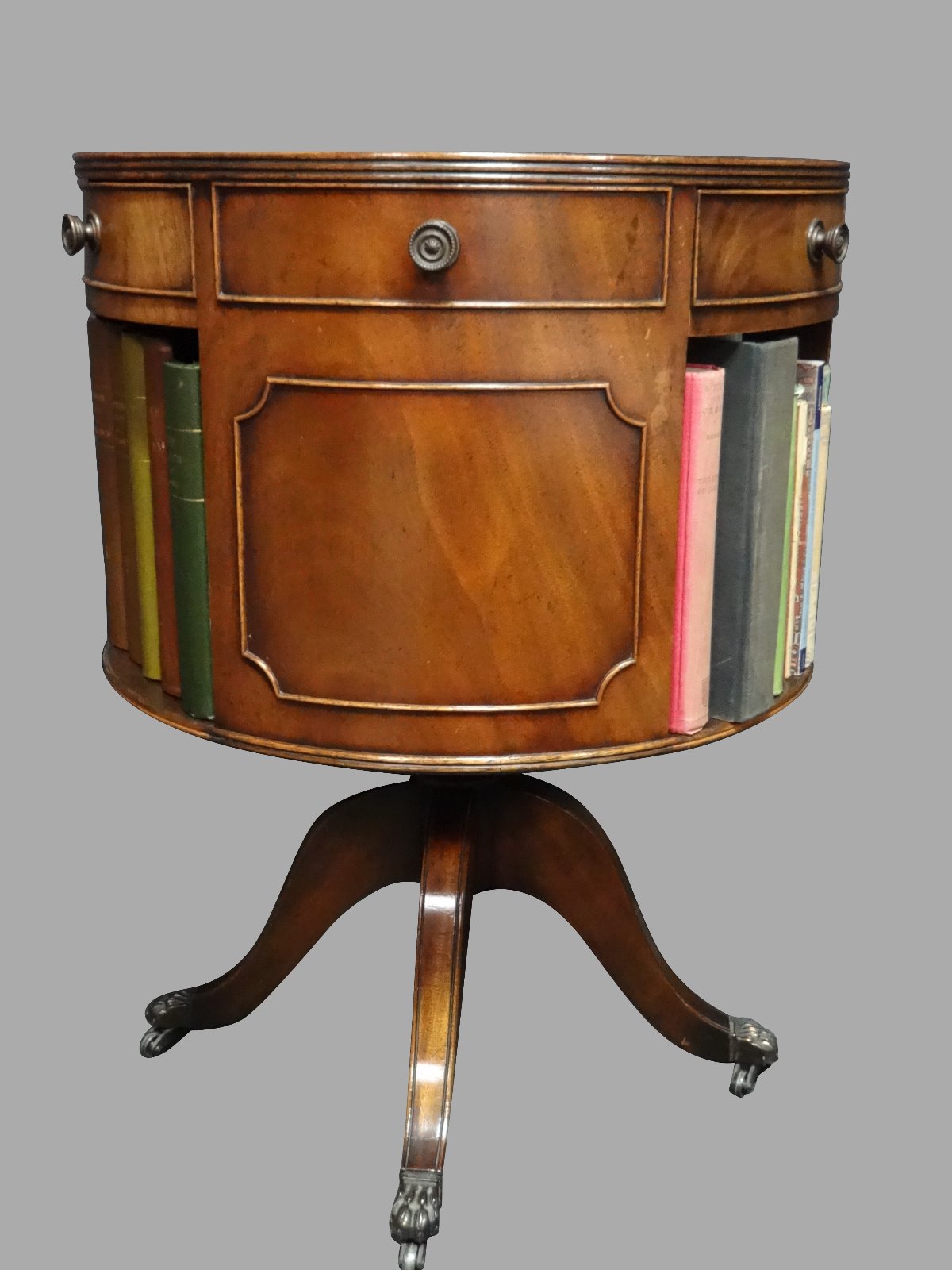 This is a very good mahogany three drawer revolving bookcase, three book compartments, red leather top in excellent condition.