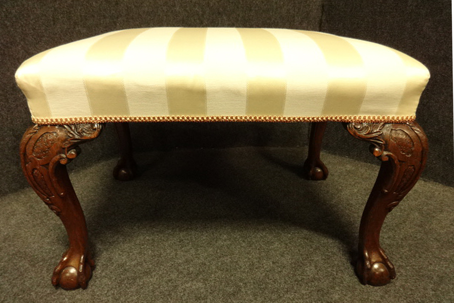 A good mahogany dressing stool, standing on carved ball and claw legs, upholstered in cream stripe, in excellent condition.