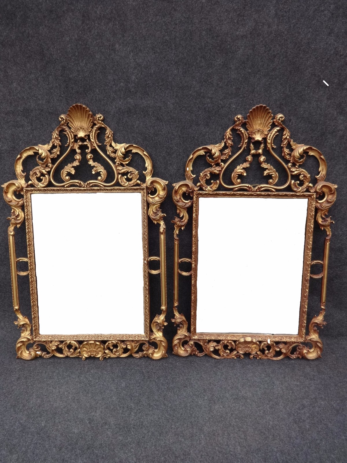 A stunning matched pair of Georgian style gilt pier mirrors, in excellent condition, bevelled glass, slight bloom on one mirror.