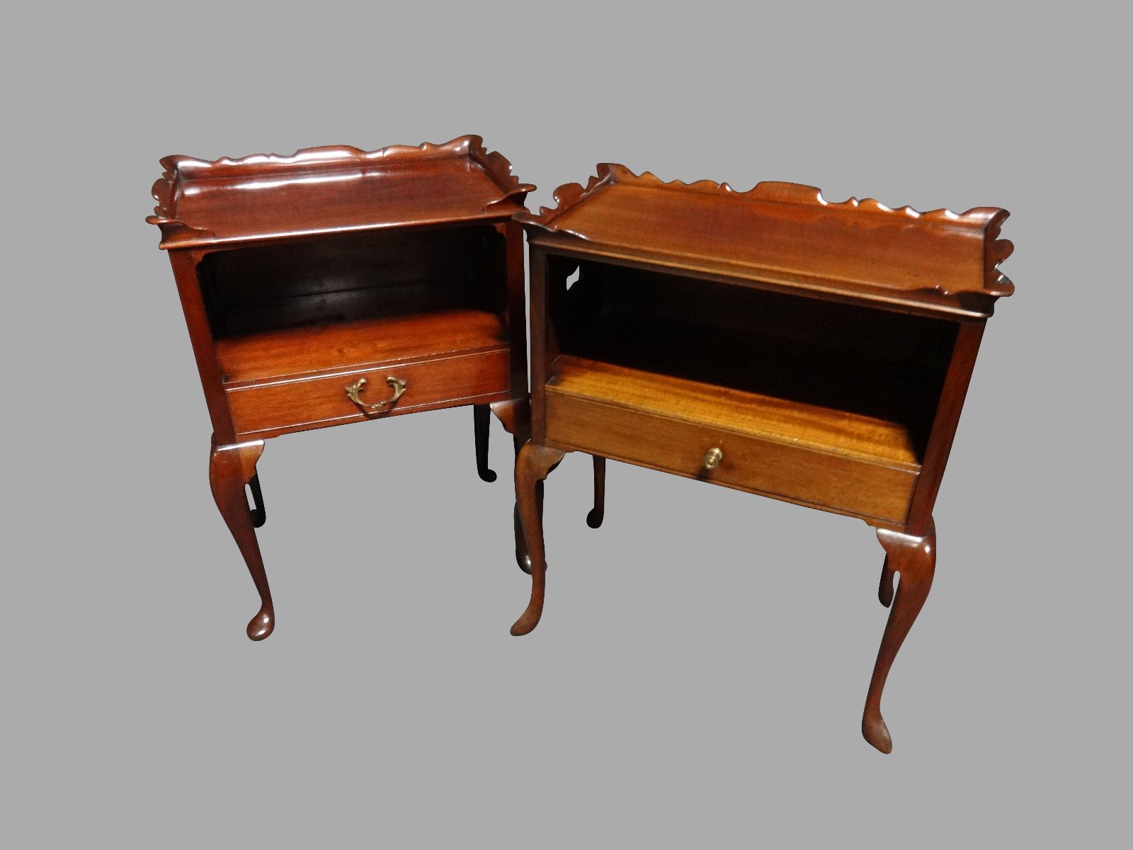 A very good near pair of mahogany bedside cabinets, with decorative tray tops and single drawers, both with carrying handles to sides, can have matching handles if preferred at no extra cost, in very good original condition.