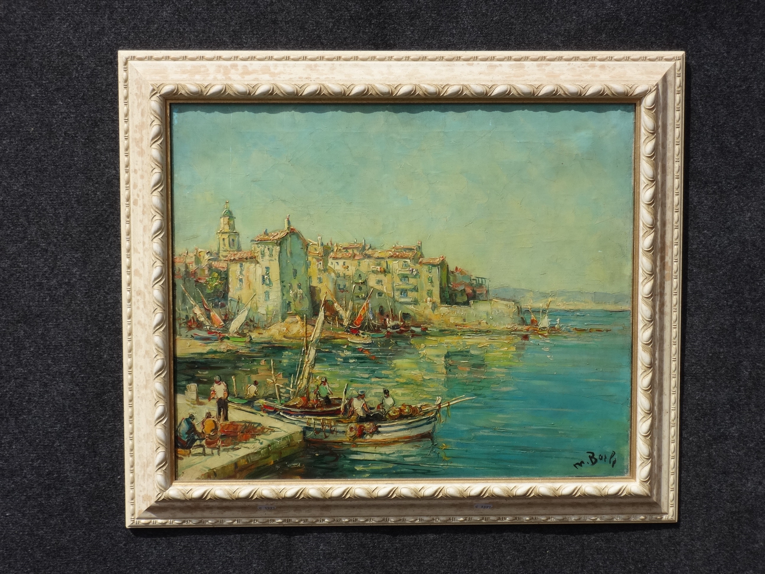 Re-framed in the 70,s a very pretty mediterranean oil on canvas signed M. Barli, in excellent condition.