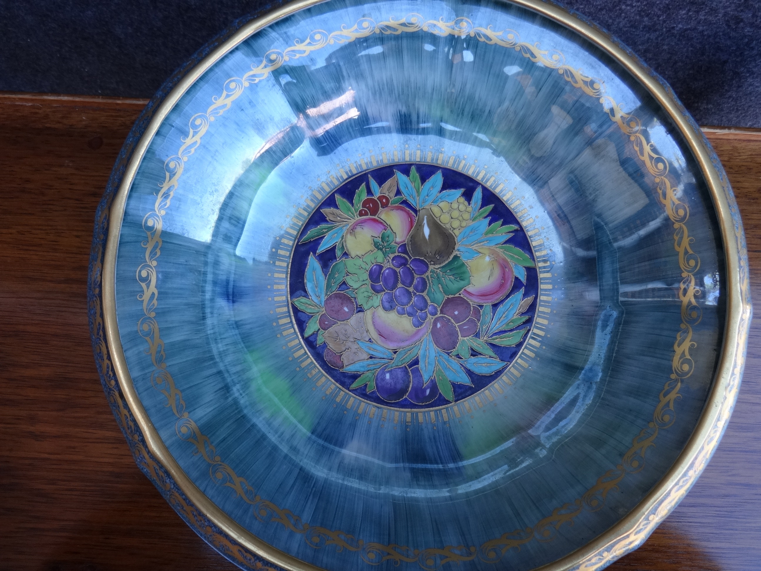 Offered for sale is this fantastic antique Minton Lustreware bowl which has a gilded decoration to the edge and central hand-painted fruit.