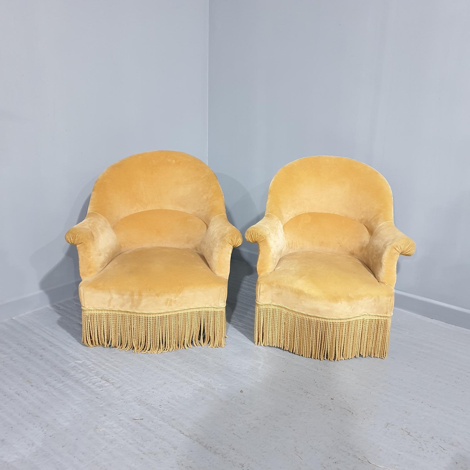 These are near pair of 19th Century French antique tub chairs with gold upholstery ad eep bullion fringing.
