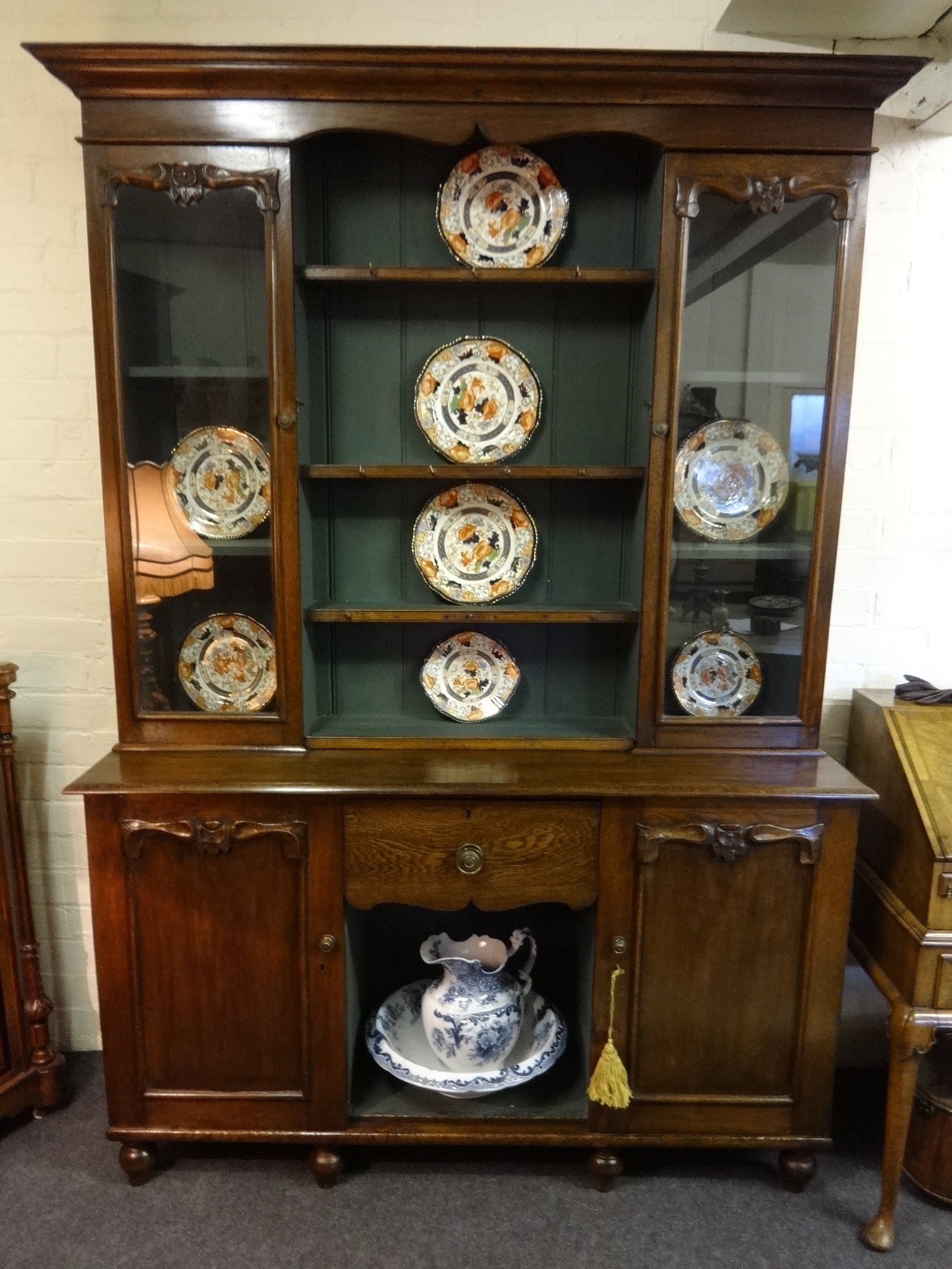 Base with central large drawer and dog kennel under, the top with central open shelving and brass hooks, flanked either side with glass doors and shelving behind, standing on bun feet, in excellent original condition.