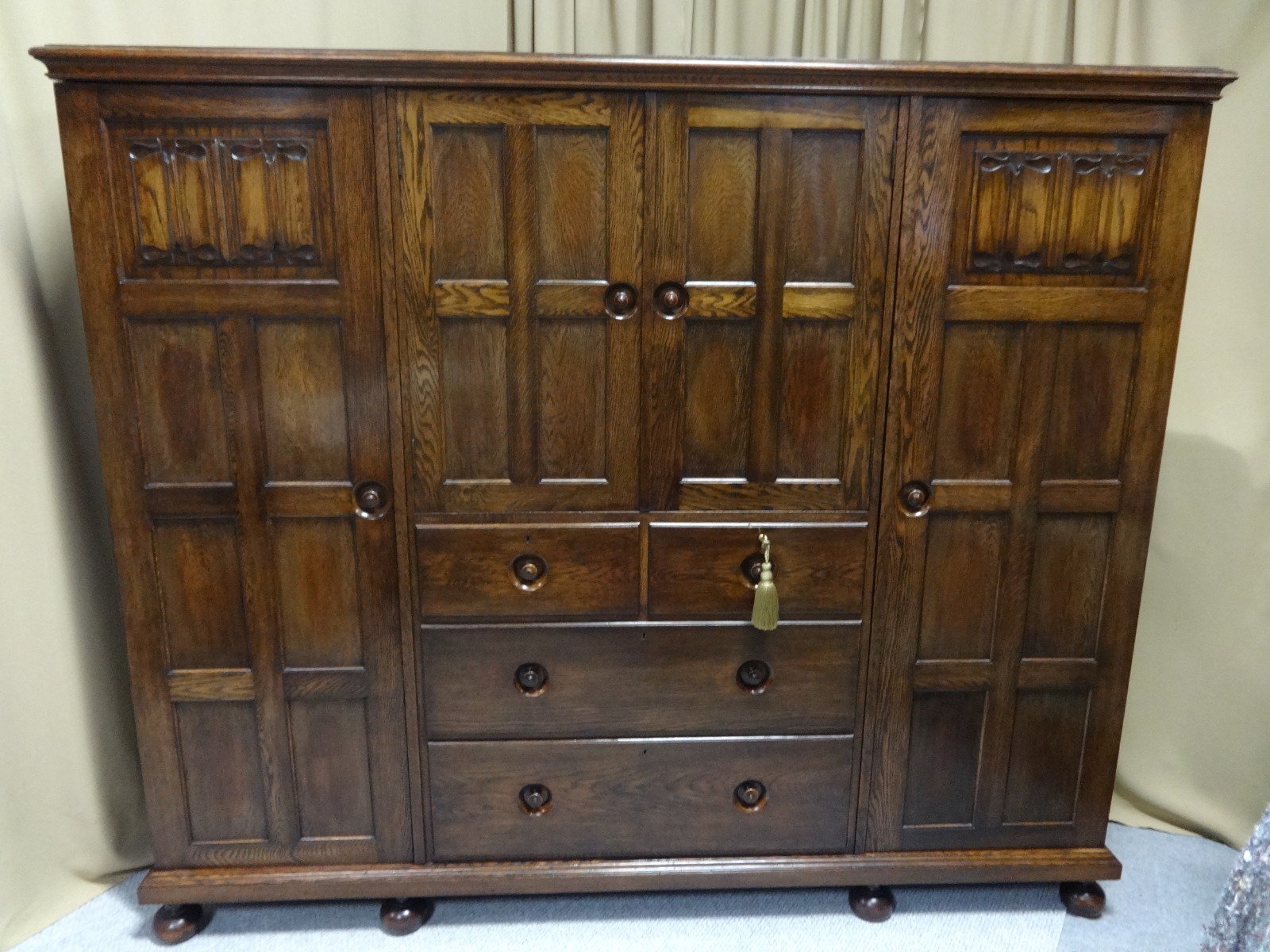 A wonderful solid oak compactum wardrobe of small proportions, two hanging robes, four drawers and shelves. Standing on bun feet, splits into five for ease of transport, excellent colour and condition.