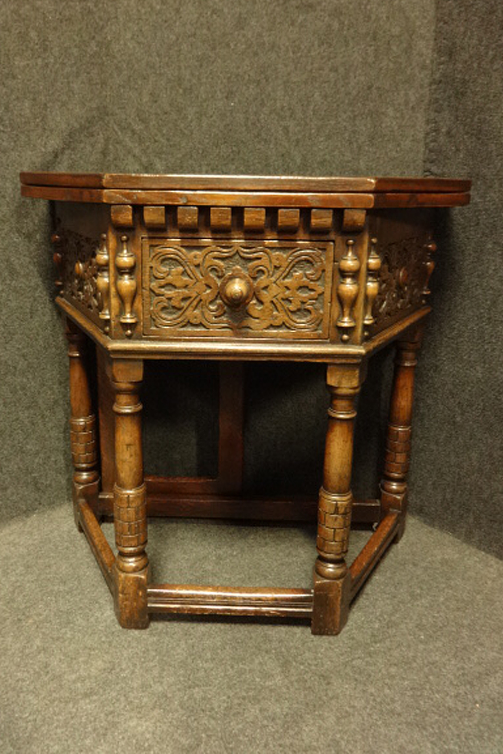 This is a very good solid oak credence table with single drawer and gate leg action. It has an excellent colour and condition.