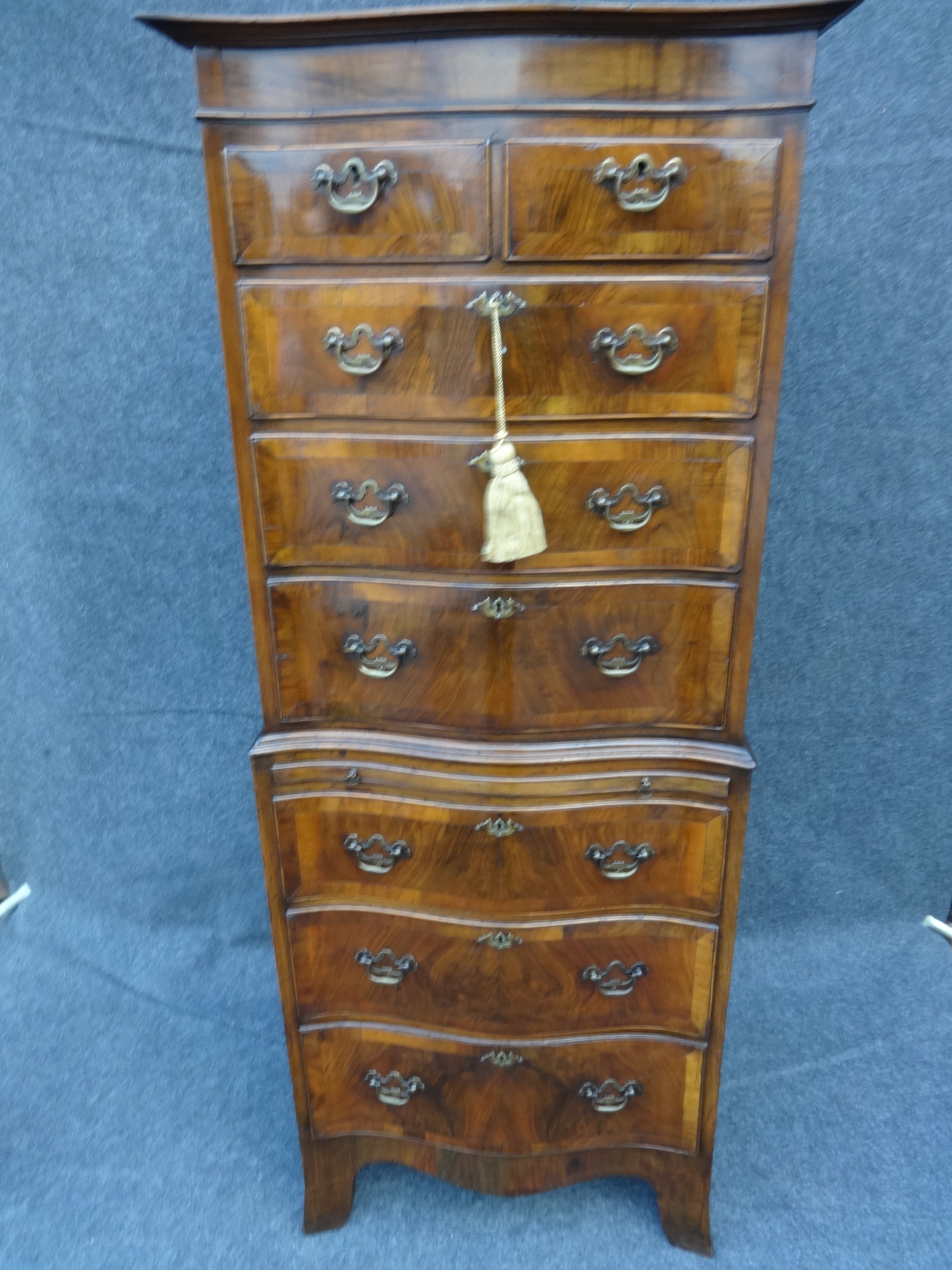 This fine antique serpentine burr walnut chest on chest is of small size with a brushing slide. It has brass handles ad estuations, outswept feet oak drawer linings and an original pine back. Comes into 2 pieces.