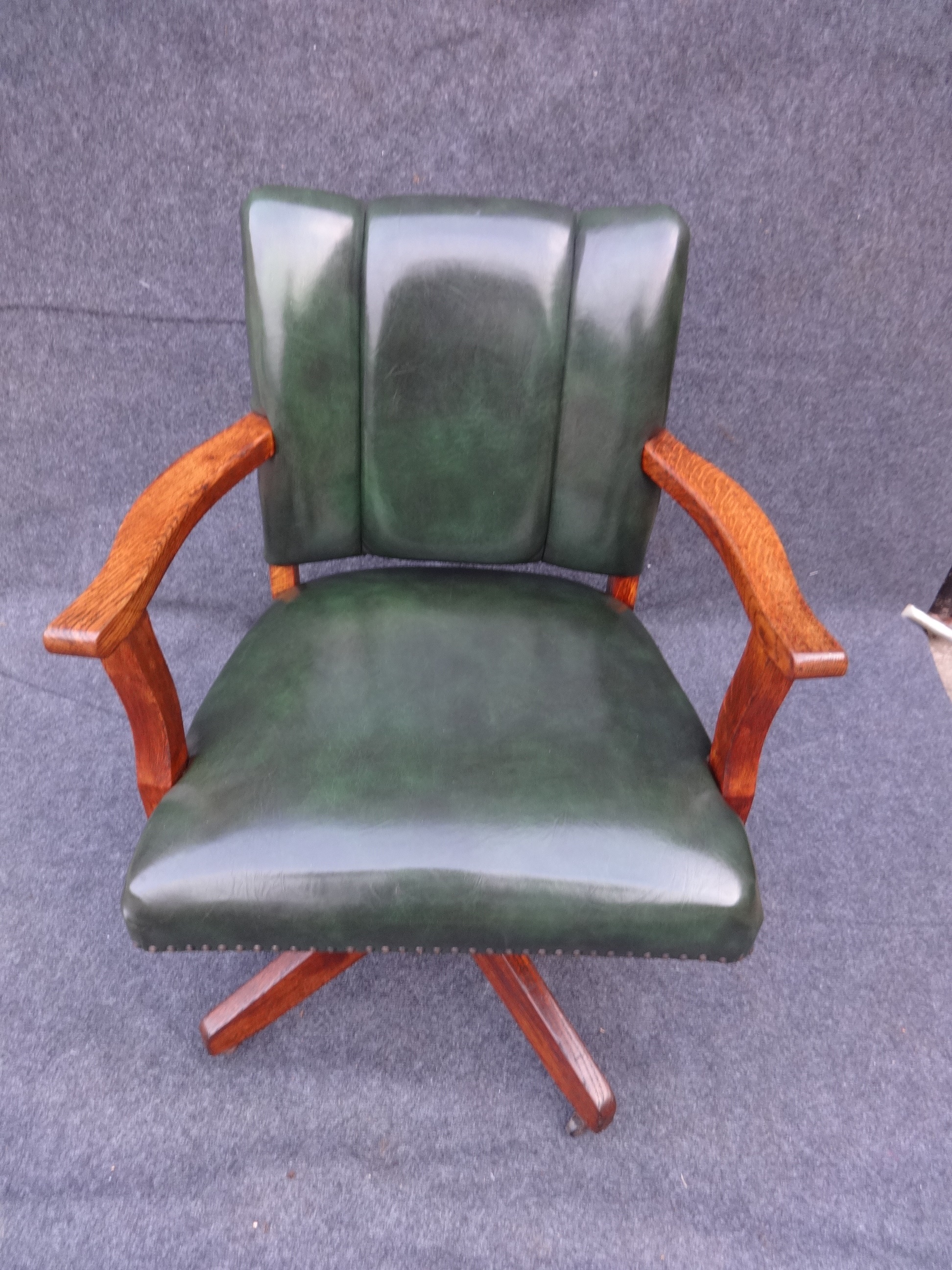 Offered for sale is this fantastic oak swivel office chair which is in very good condition. It has a green faux leather.