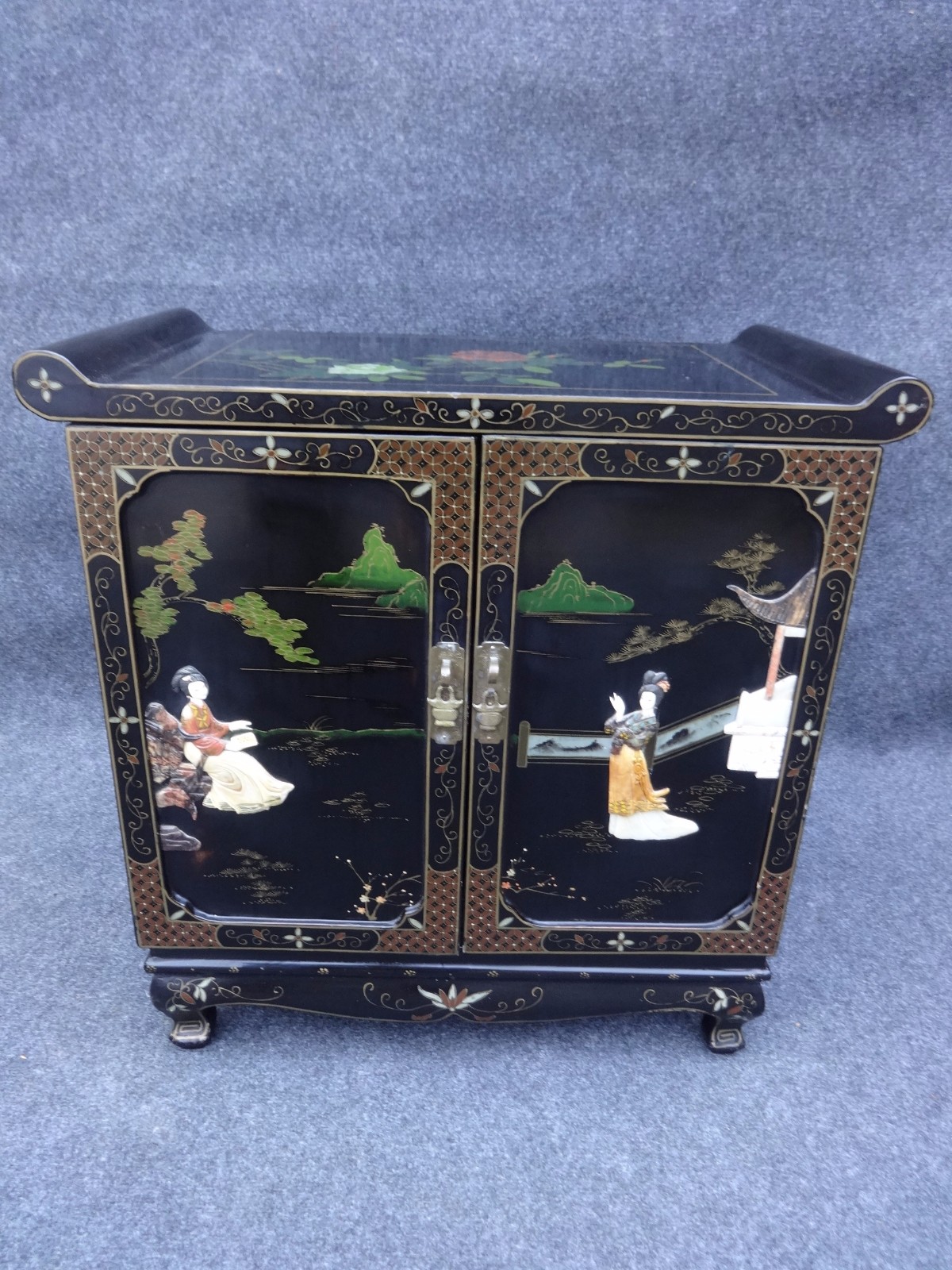 This is a very pretty Chinese 2 door cabinet with semi precious stones and hand painted decoration in very good condition.