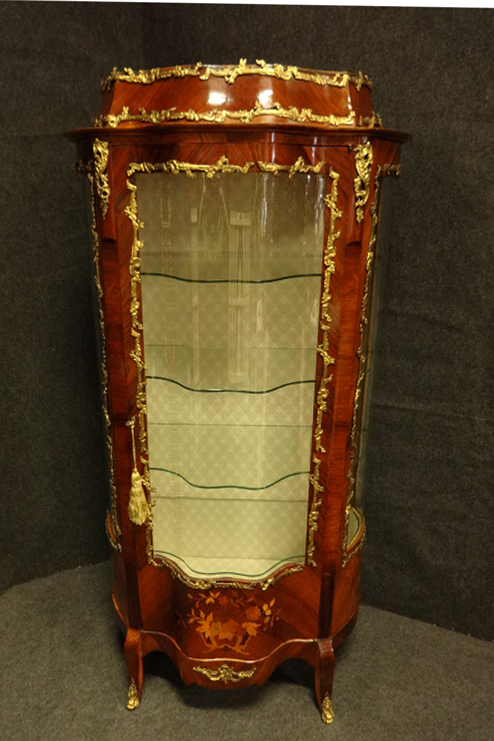 This is a very good double serpentine fronted rosewood vitrine with floral marquetry panels to the base, bowed glass sides, 4 shaped plate glass shelves, gilt metal mounts, relined and repolished to a very high standard.