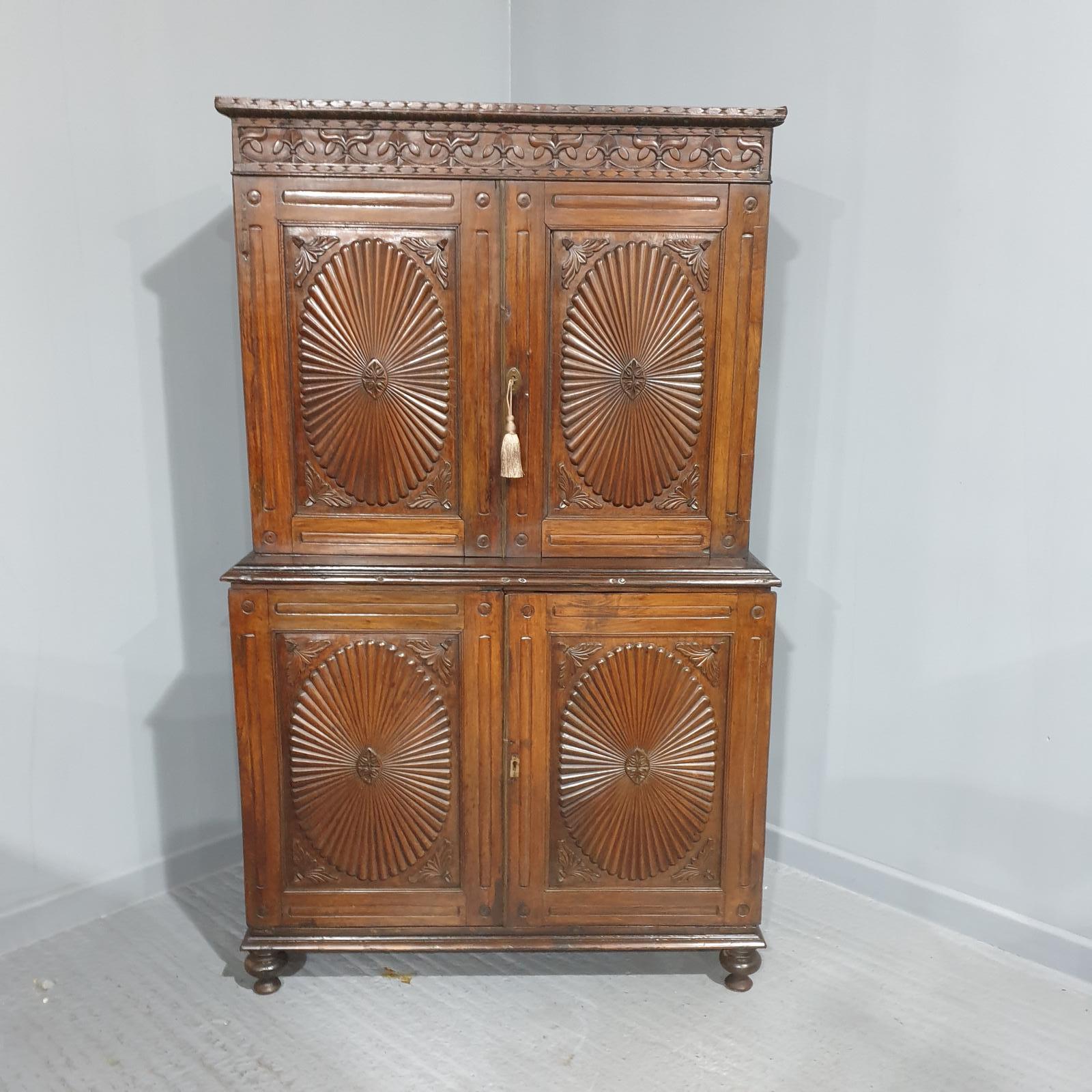 Fine two part Anglo Indian carved cabinet or linen press, brass slamming strips, turned feet, shelves to both parts, stunning carved pleated medallions and corner spandrels, made from rosewood.