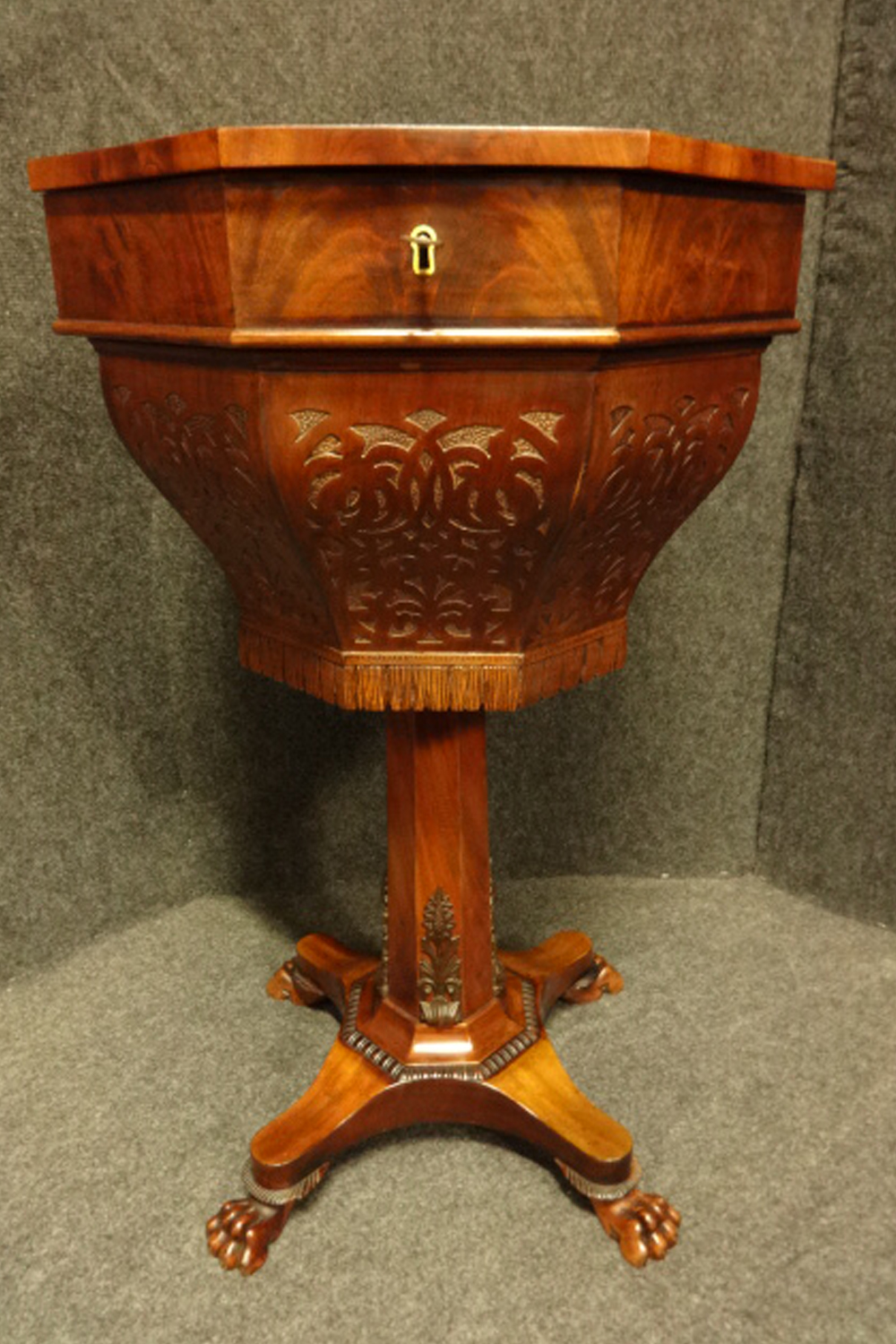 A top quality mahogany sewing box, standing on paw feet, with pierced effect box with carved tassel decoration, wooden lids to the interior with all cotton winders, excellent colour.