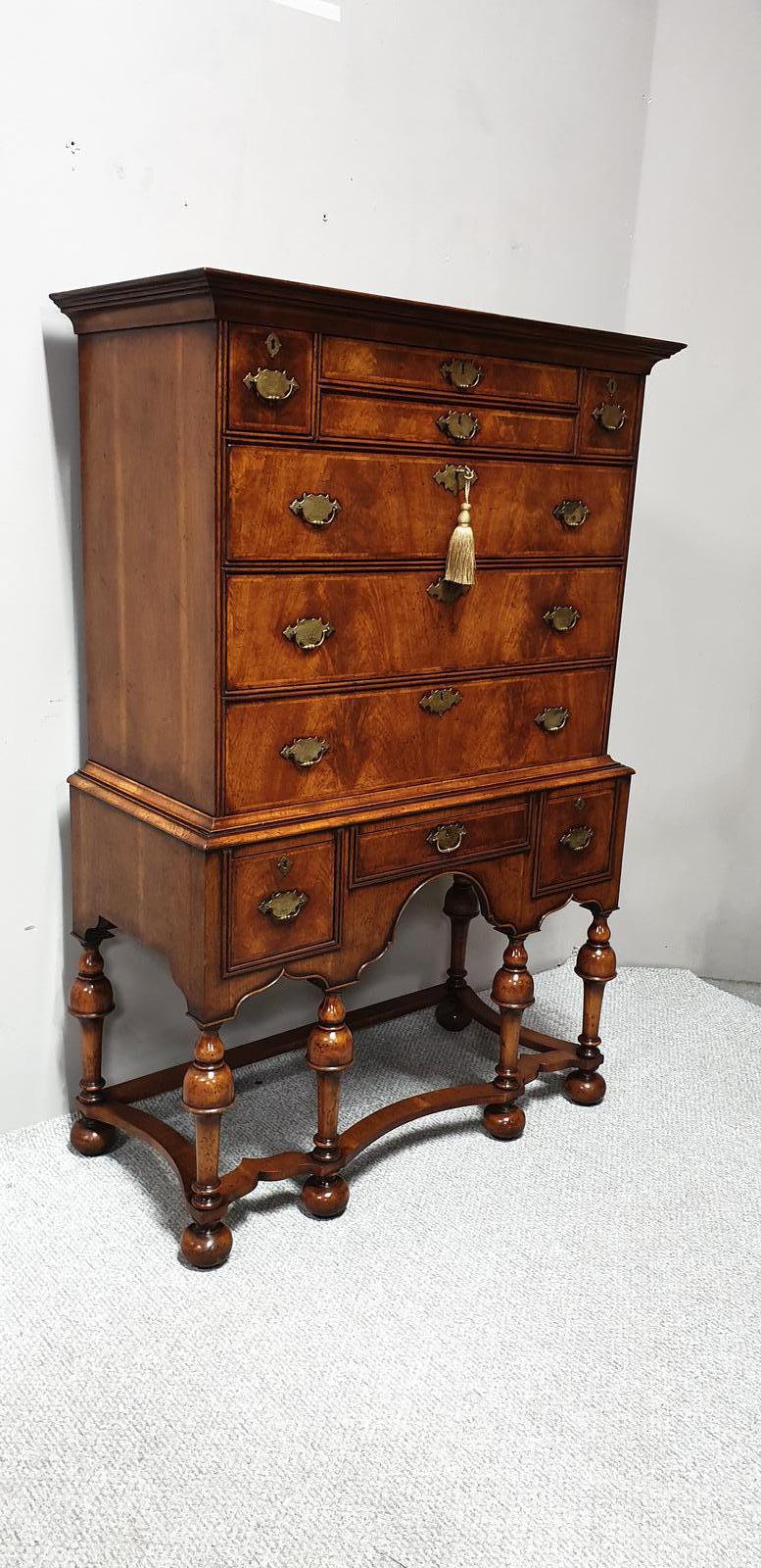A super Queen Anne style burr walnut chest on stand, herringbone inlay, brass handles, great configuration of drawers,, shaped understretcher, splits into two, pine lined, excellent colour and condition.