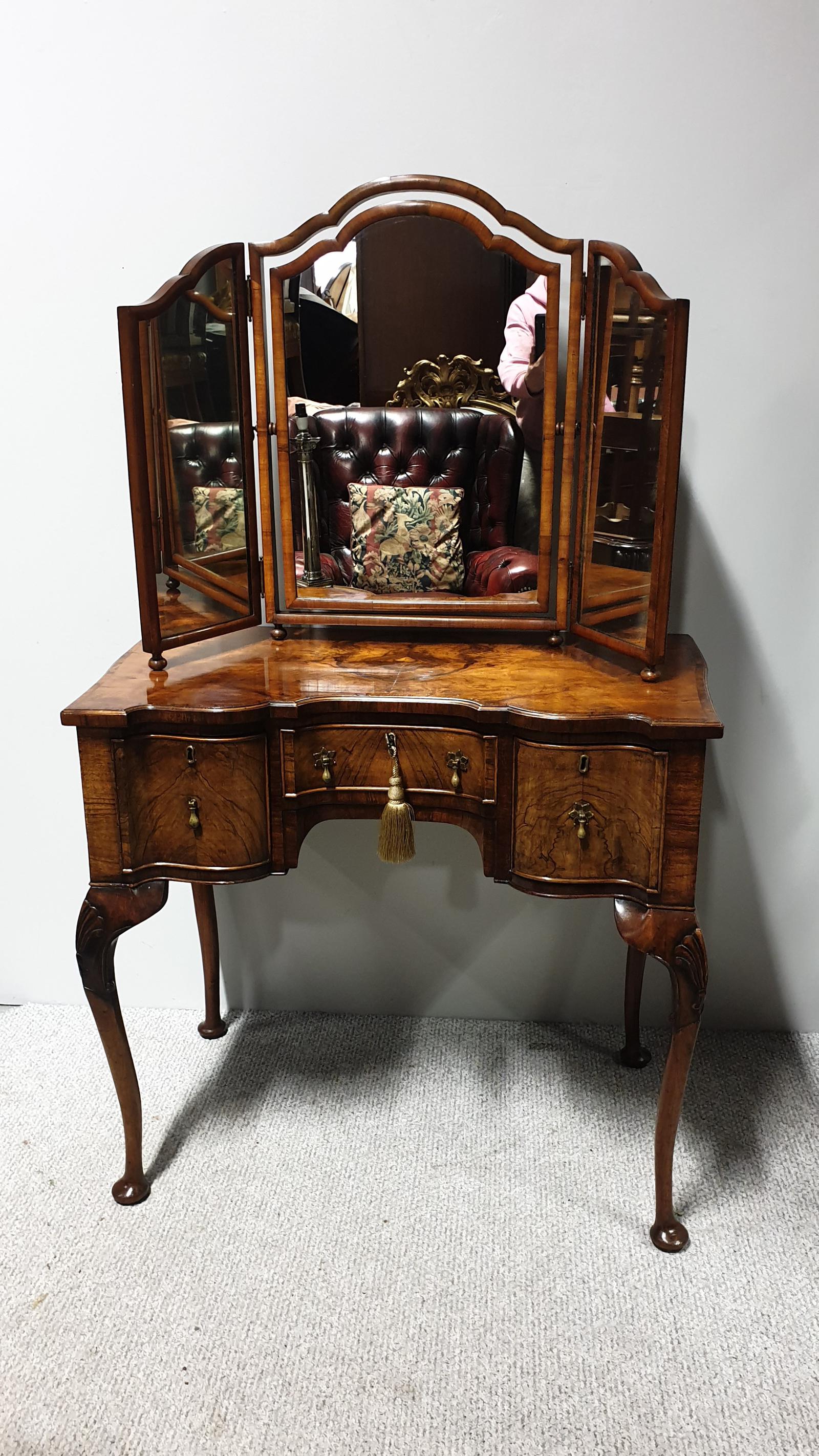 A superior quality Queen Anne style burr walnut shaped dressing table standing on cabriole legs, with two opening drawers and one cupboard, all with brass handles with a freestanding tryptic walnut adjustable mirror (slight foxing to one part of the mirror) other wise in excellent original condition. All oak lined.